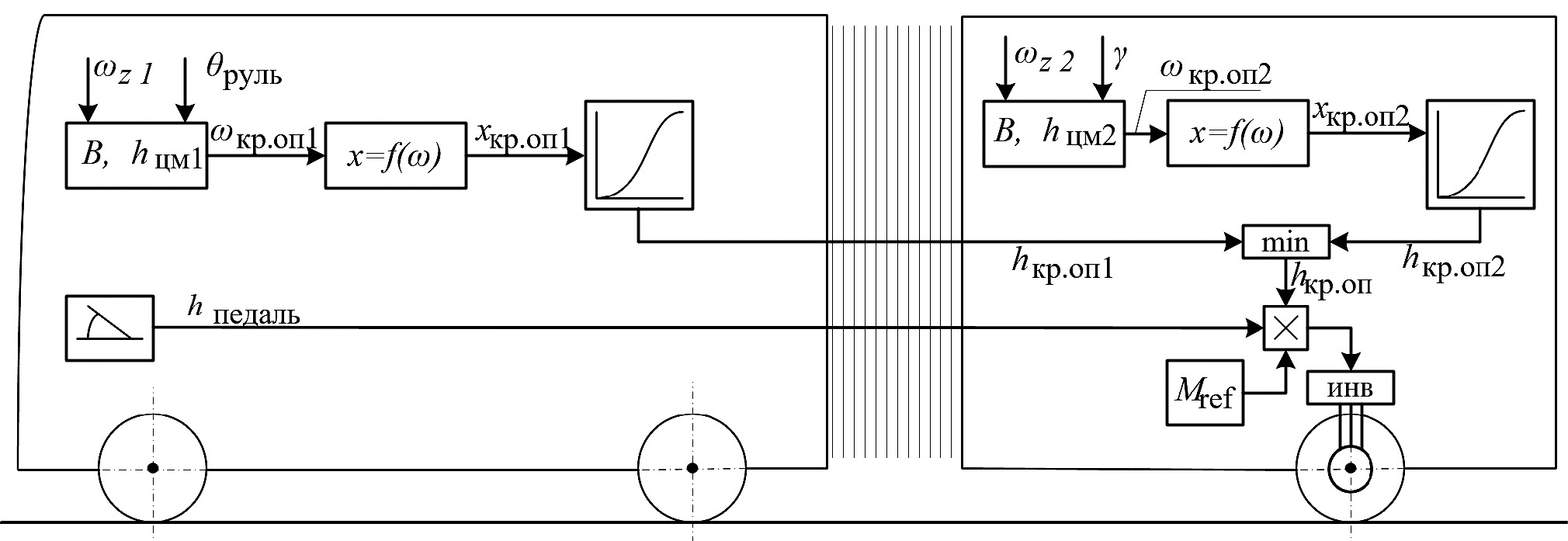 Fig. 2. The block diagram of the formation of the requested torque to the traction inverter; ωz1 — measured yaw rate of the front section, rad/s; ωz2 — measured yaw rate of the second section, rad/s; B — wheel track, m; hцм1 — height of the center of mass of the front section, m; hцм2 — height of the center of mass of the rear section, m; θруль — steer angle of the steerable wheels, rad; γ — measured articulation angle, rad; xкр.оп1 — control error in the front section; xкр.оп2 — control error in the rear section; hкр.оп1 — multiplier of the regulator of the front section; hкр.оп2 — multiplier of the regulator of the rear section; hкр.оп — regulator multiplier, the minimum of hкр.оп1, hкр.оп2; Mref — maximal torque, N∙m; hпедаль — the degree of pressing the stroke pedal; «инв» — inverter.