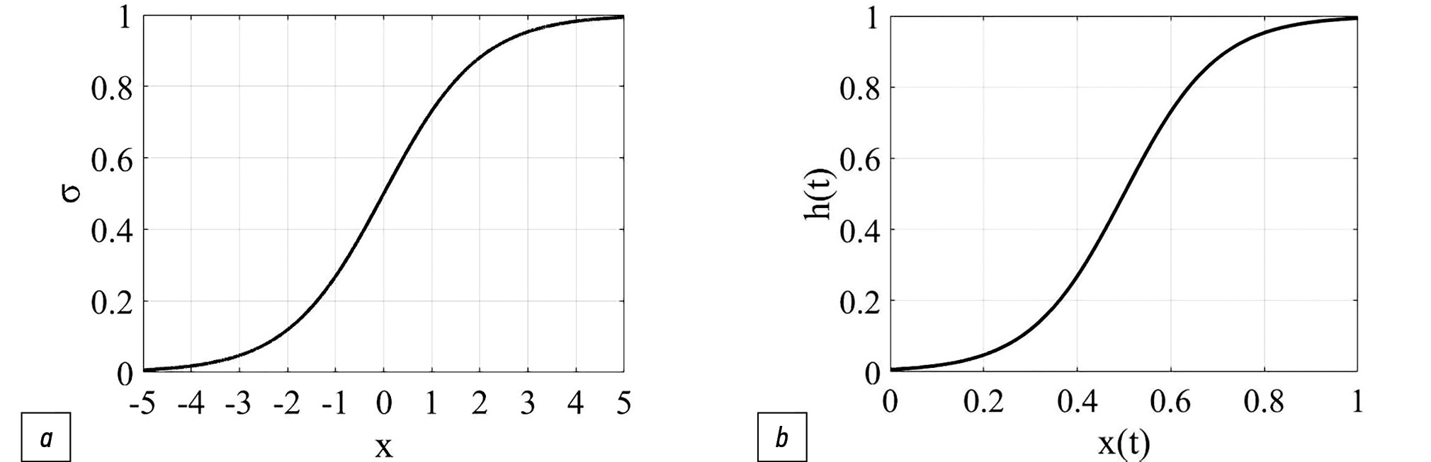 Рис. 3. Форма логистической функции: a — стандартной; b — преобразованной. x — аргумент логистической функции; x(t) — аргумент преобразованной логистической функции; σ — выходная переменная логистической функции; h(t) — выходная переменная преобразованной логистической функции.