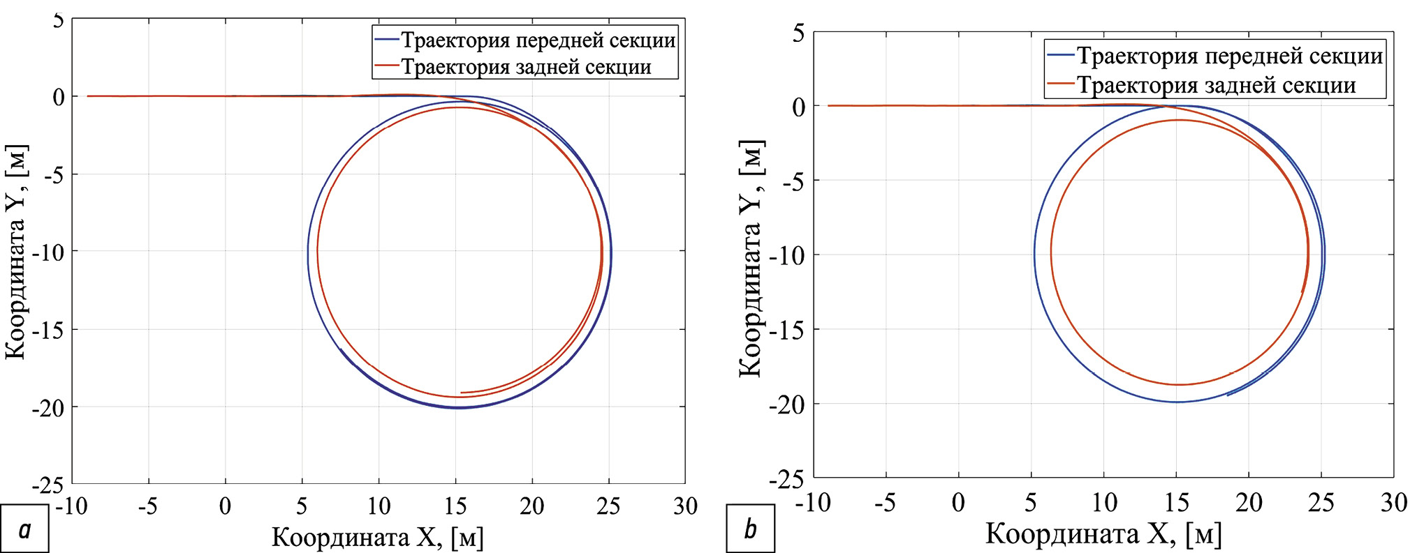 Рис. 4. Траектории электробусов: a — Электробуса 1; b — Электробуса 2: синий график — траектория центра масс передней секции; оранжевый график — траектория центра масс задней секции.