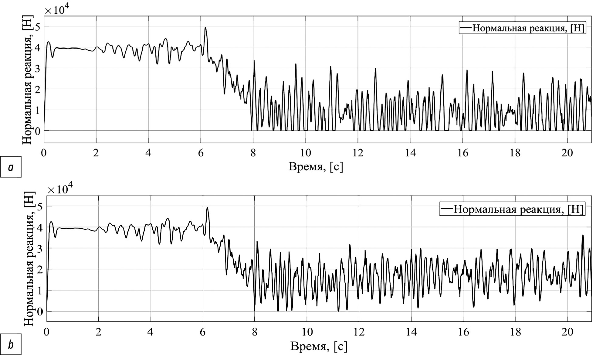 Рис. 5. Нормальная реакция на заднем ведущем колесе внутреннего борта: a — Электробуса 1; b — Электробуса 2.