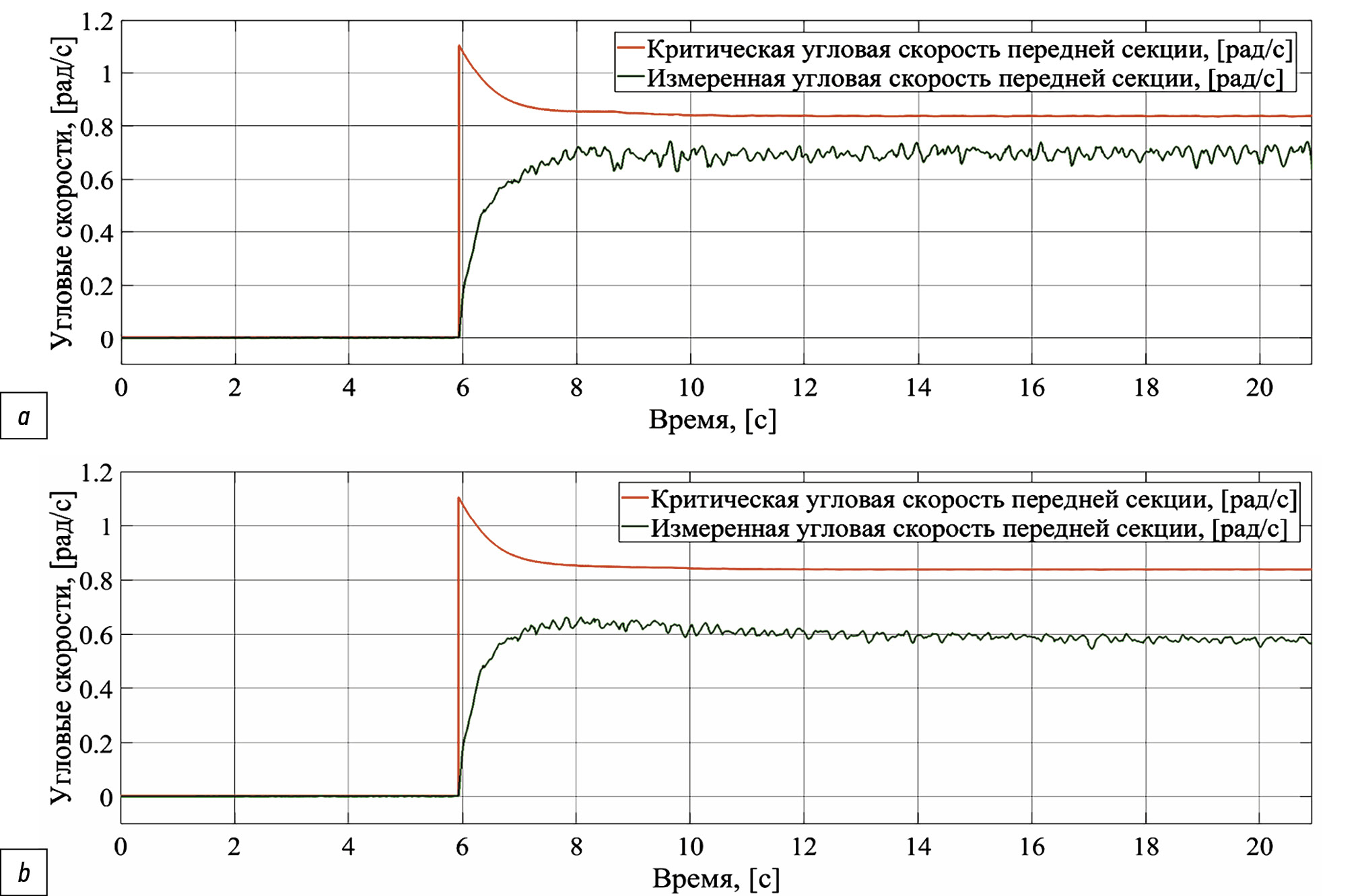Рис. 6. Критическая и измеренная угловые скорости вращения передней секции: a — Электробуса 1; b — Электробуса 2; красный график — критическая угловая скорость передней секции; зелёный график — измеренная угловая скорость передней секции.