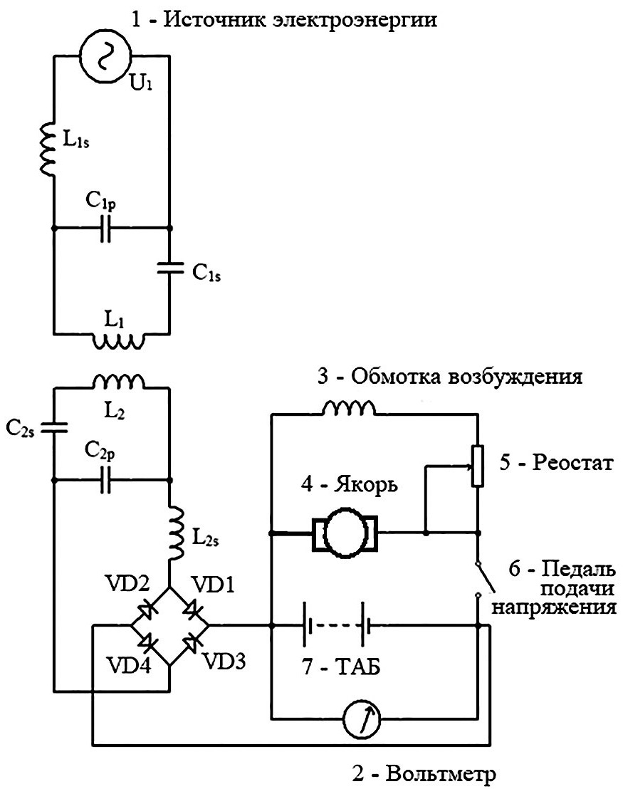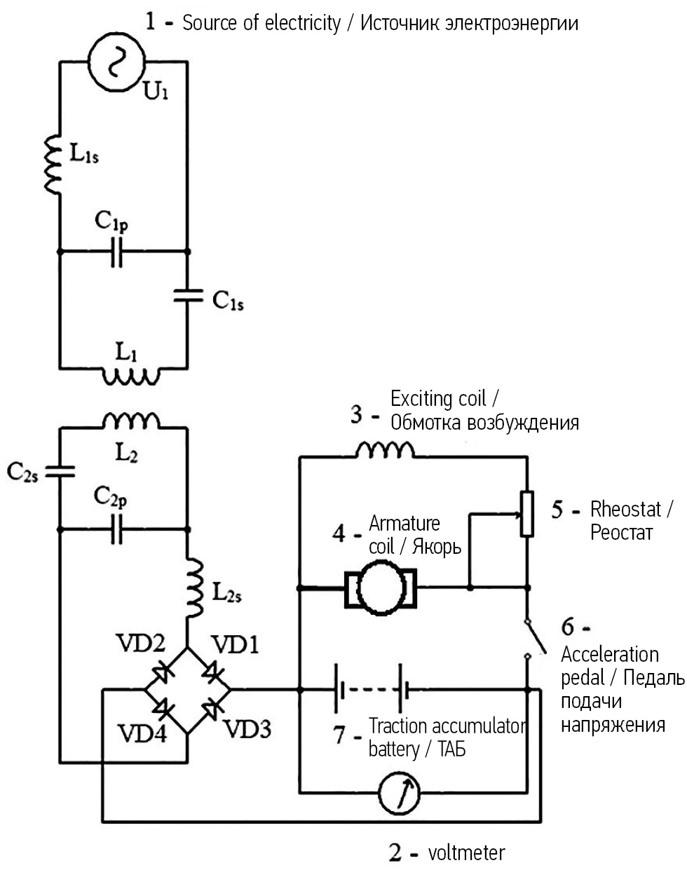 The primary coil of the air-core transformer, to which the alternating supply voltage is applied, is located under the bearing surface. The primary current flow generates an alternating magnetic field that penetrates the turns of the secondary coil, which can be installed either inside the tires or at the bottom of the electric vehicle. In the secondary coil, a self-induction EMF is generated and supplied to the rectifier input. If the secondary coil is installed inside the buses, brushes and slip rings are used to supply the EMF. A single-phase full-wave rectifier is provided to convert alternating current to direct current and control the charging voltage of the capacitor. During acceleration or steady movement of the electric vehicle, the capacitor voltage is supplied to both the armature coil and the excitation coil of the traction motor. The DC motor torque is transferred to the drive wheel via the drive gear. During regenerative braking, the torque from the drive wheel is supplied to the DC machine using the above systems, and the DC machine is switched to the generator mode.