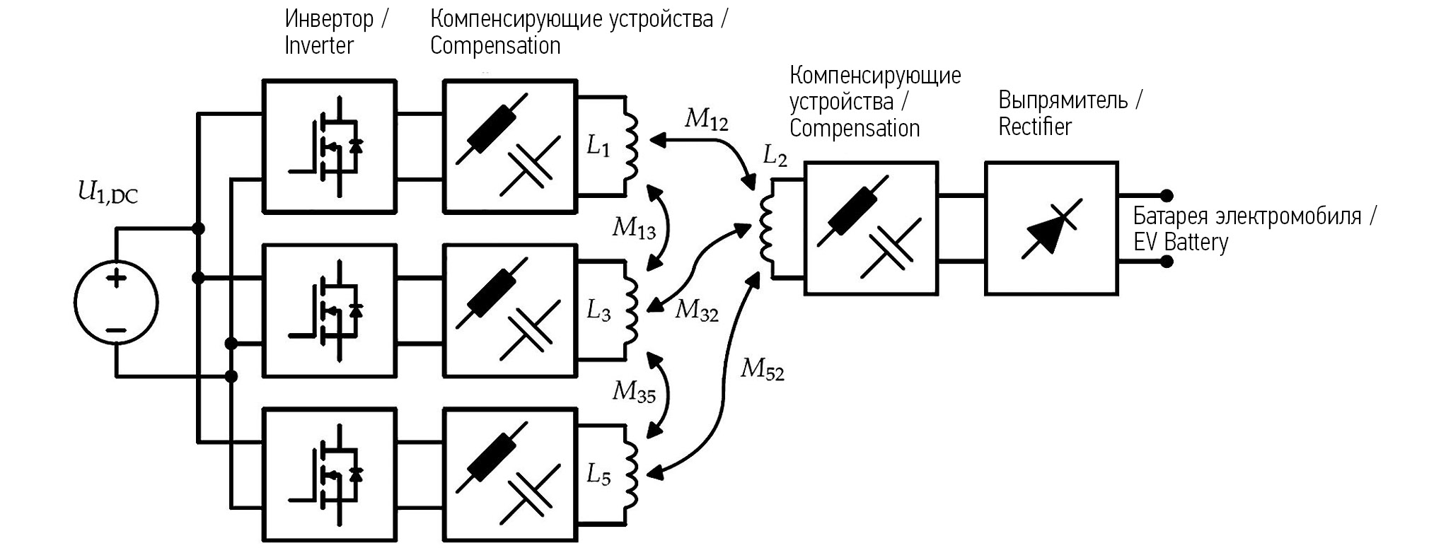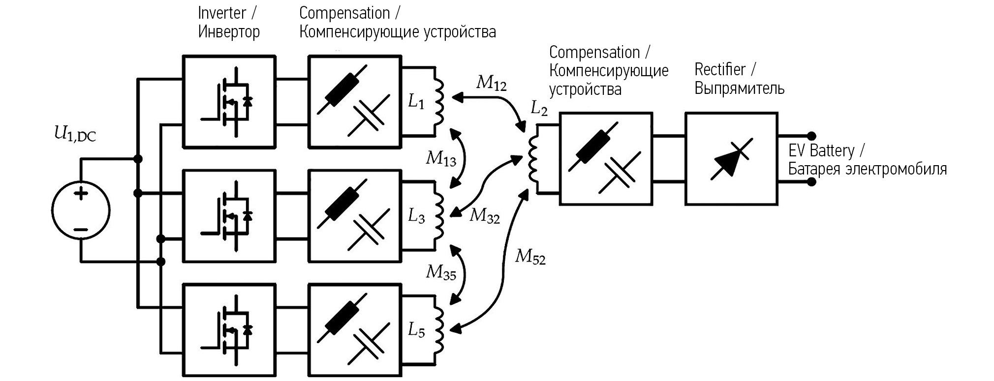 Рис. 2. Электрическая схема резонансной системы электроснабжения электромобиля с несколькими первичными обмотками.