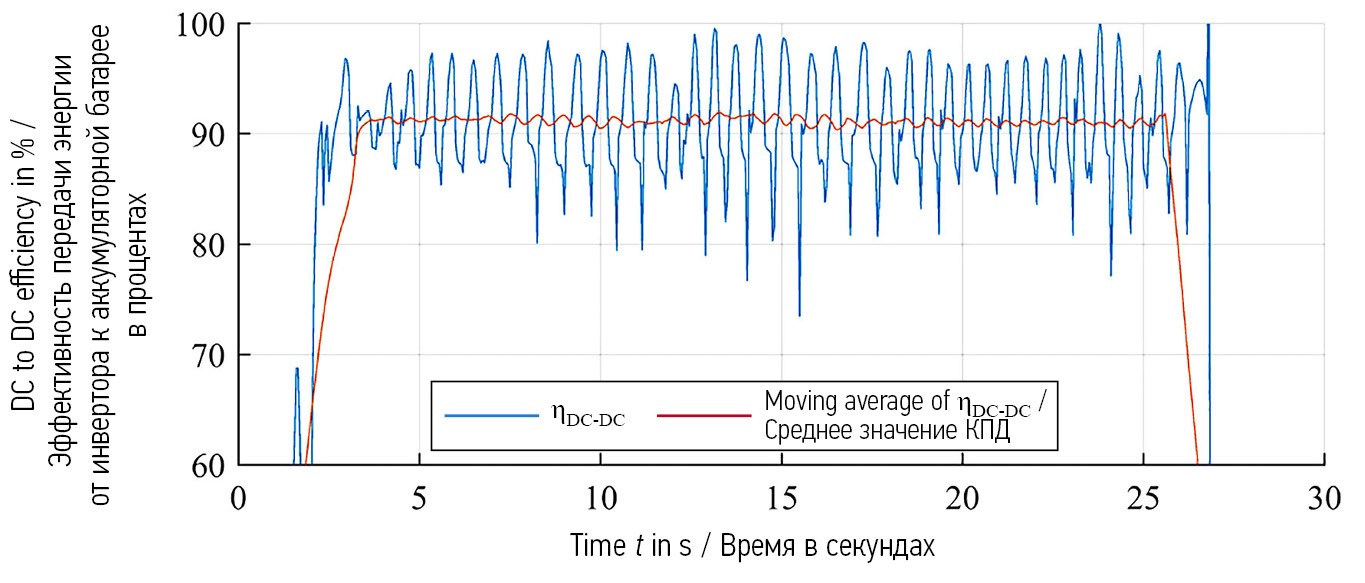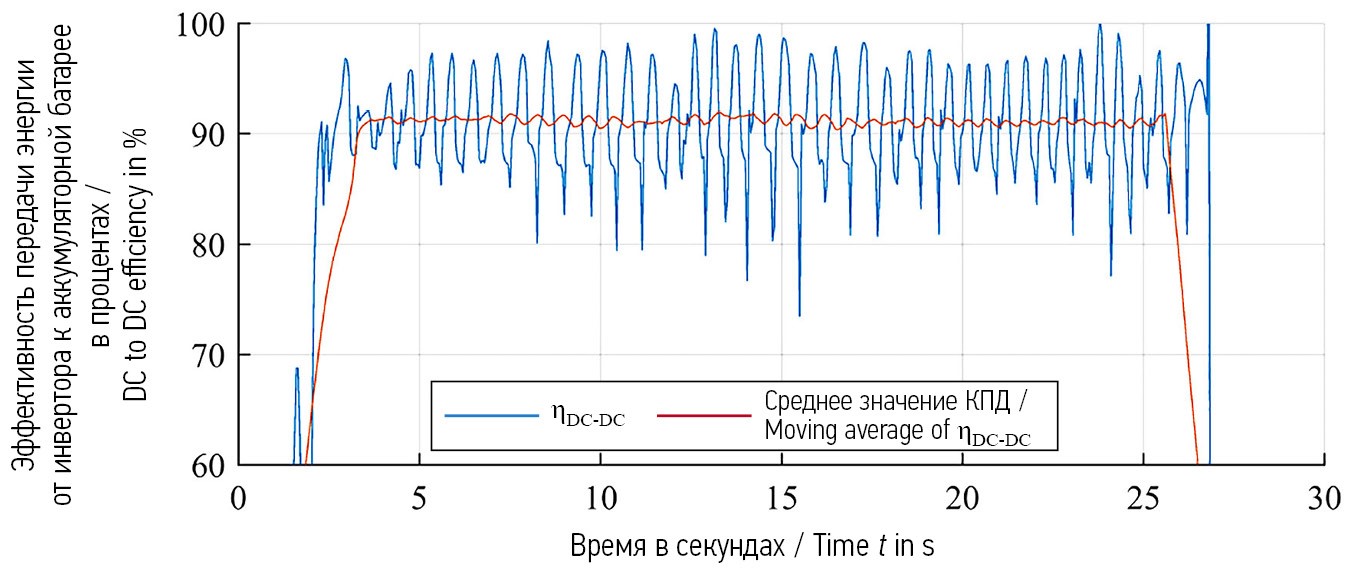 Fig. 3. Temporal variation curves of system efficiency: DC to DC efficiency (%) is the energy transfer efficiency from inverter to battery in percent; time t, (s) is the time in seconds; ηDC-DC is the efficiency; moving average of ηDC-DC is the average efficiency.