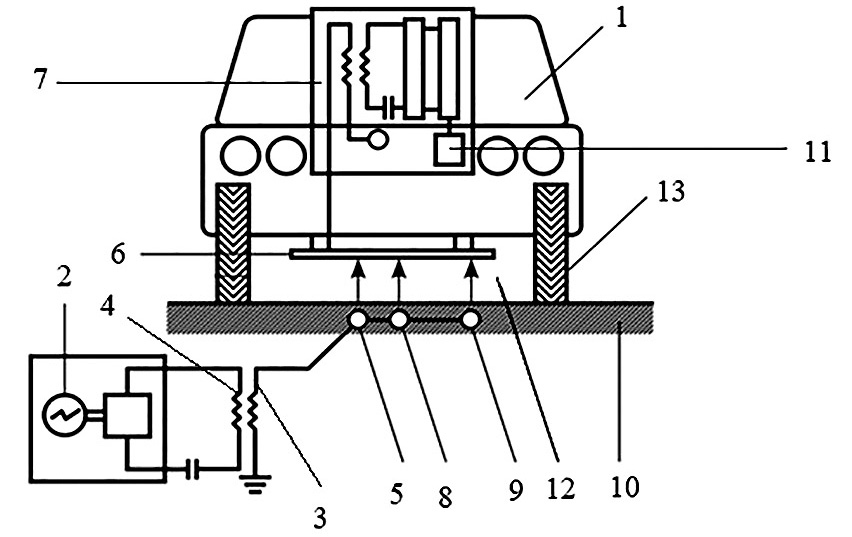Рис. 4. Устройство системы электроснабжения транспортного средства методом электростатической индукции: 1 — электромобиль; 2 — источник электроэнергии; 3 — вторичная обмотка трансформатора; 4 — первичная цепь трансформатора; 5, 8, 9 — сетевые кабели; 6 — нейтральная пластина; 7 — преобразовательно-коммутационная аппаратура; 10 — опорная поверхность; 11 — бортовой накопитель энергии; 12 — воздушный промежуток; 13 — колесо.