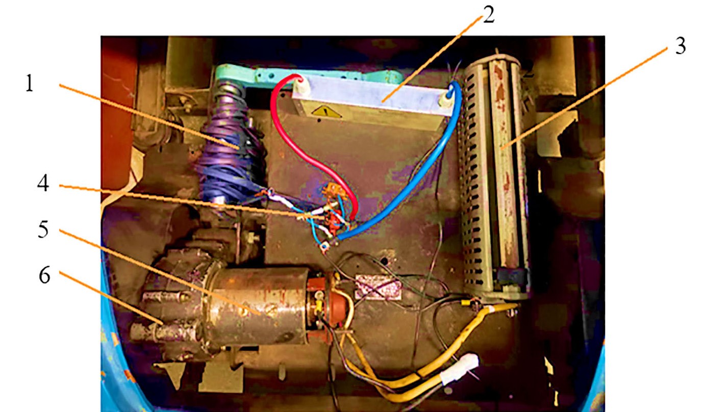 Fig. 6. The traction electric system of a prototype: 1: secondary coil; 2: capacitor; 3: rheostat; 4: rectifier; 5: traction motor; 6: axle drive.