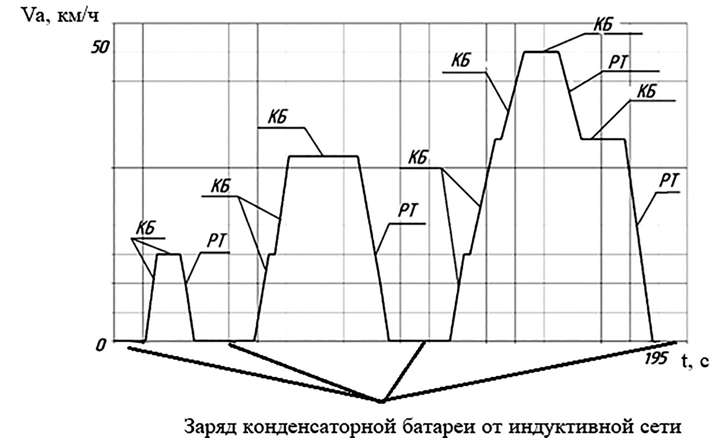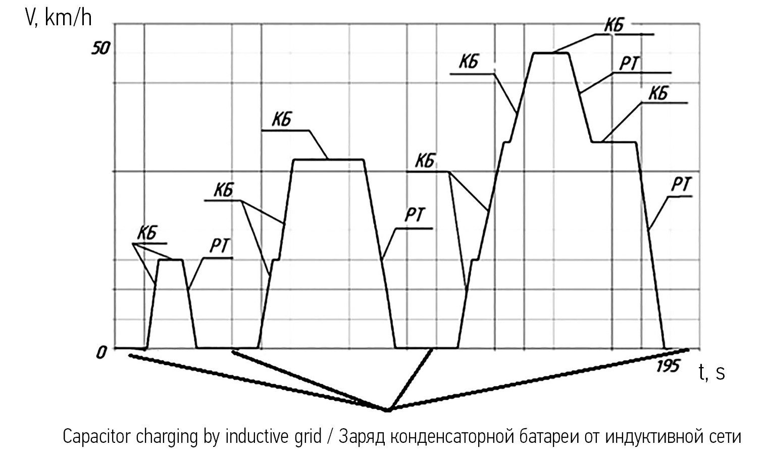 Fig. 7. Operational algorithm of the traction voltage system in the urban driving cycle: КБ: the capacitor is used for driving; PT: regenerative braking.