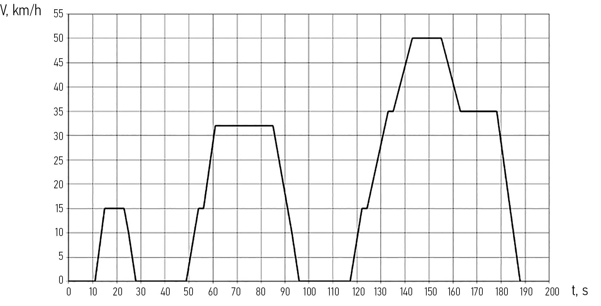 The cycle provided by UNECE Regulation No. 83 [14] is taken as the fuel efficiency and exhaust toxicity test cycle. According to the rules, the cycle consists of two parts, namely urban and highway. The research and calculations will be based on the urban electric vehicle; thus, it is advisable to use the first part of the cycle only (Fig. 5). The total duration of the urban driving cycle is 195 s.