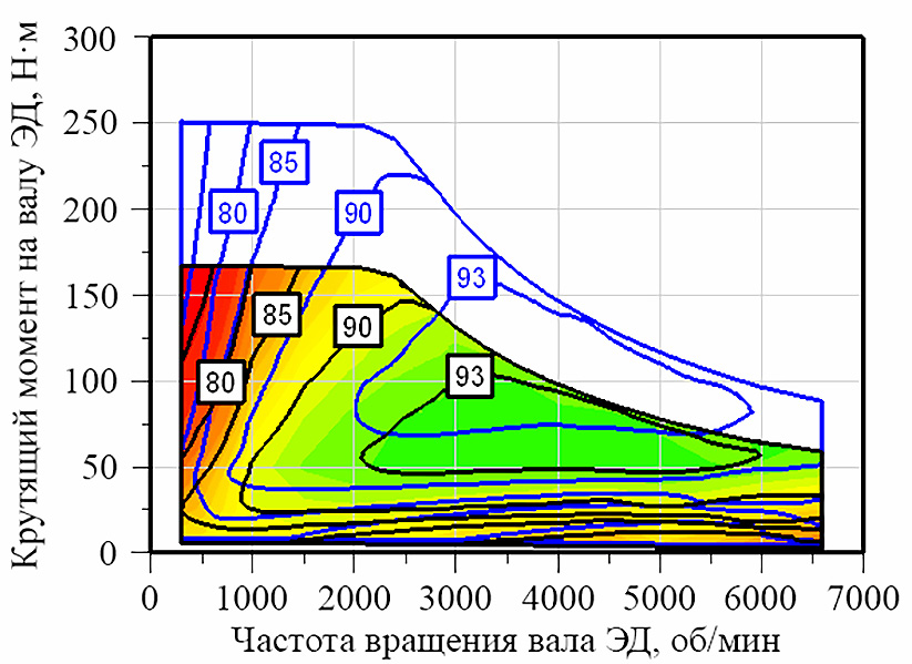 Рис. 1. Сравнение КПД ЭД различной мощности [7]. Чёрными линиями обозначены области, соответствующие ЭД мощностью 40 кВт, синими линиями — ЭД мощностью 60 кВт.