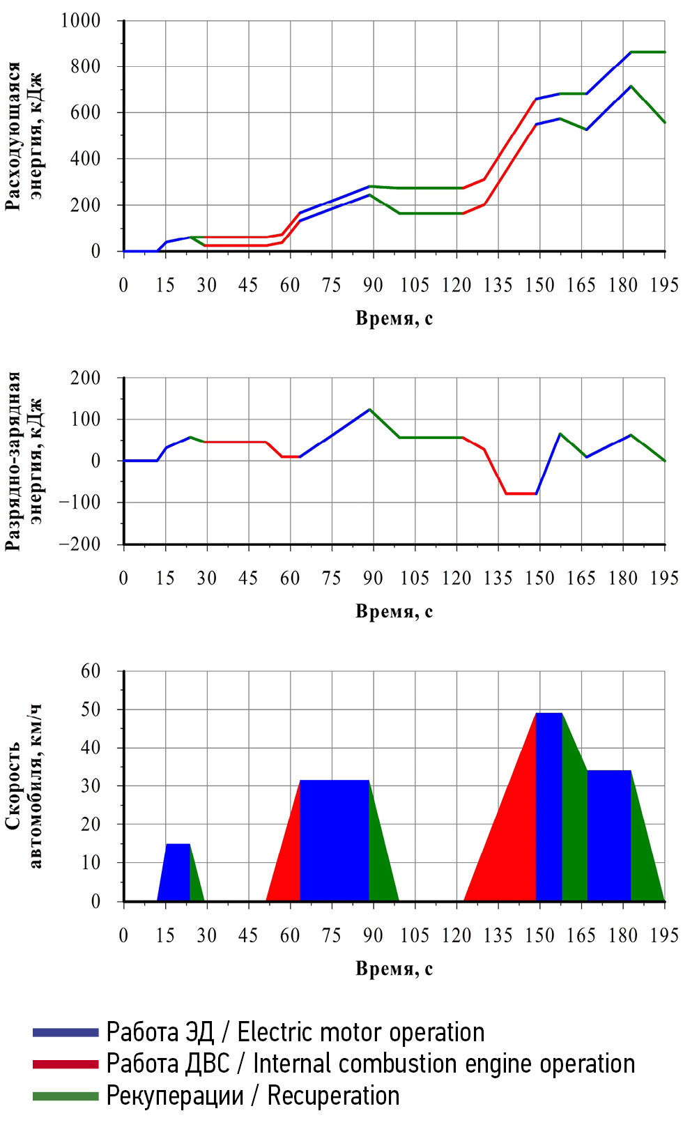 Как можно видеть, зарядно-разрядной баланс является нулевым, поскольку вся энергия, поступающая на аккумуляторную батарею от ДВС и от рекуперации, расходуется на движение автомобиля в режиме электротяги.