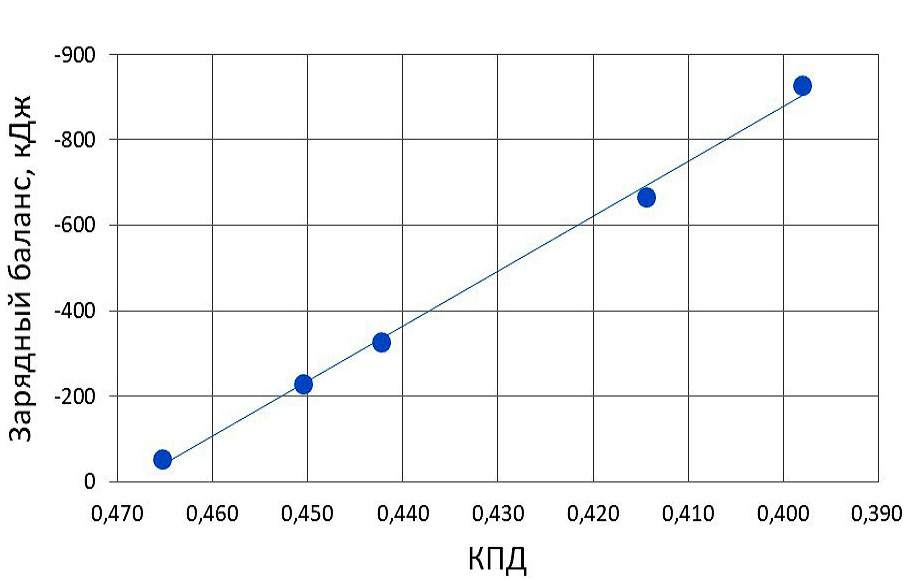 Ранее была получена зависимость между КПД СУ и зарядным балансом [3]. Данная зависимость (рис. 3) показывает прямо пропорциональную связь между этими величинами. При нулевом зарядно-разрядным балансе на ТАБ КПД СУ имеет максимальное значение.