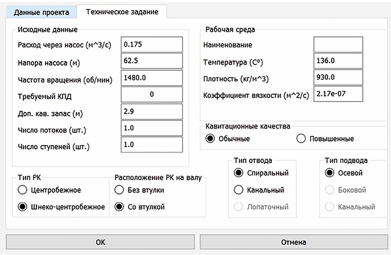 Для примера разбирается расчёт шнеко-центробежной ступени на заданные по ТЗ (техническому заданию) параметры (рис. 1). Расчёт элементов проточной части выполняется последовательно, начиная от шнека и заканчивая тангенциальным выходным диффузором спирального отвода.