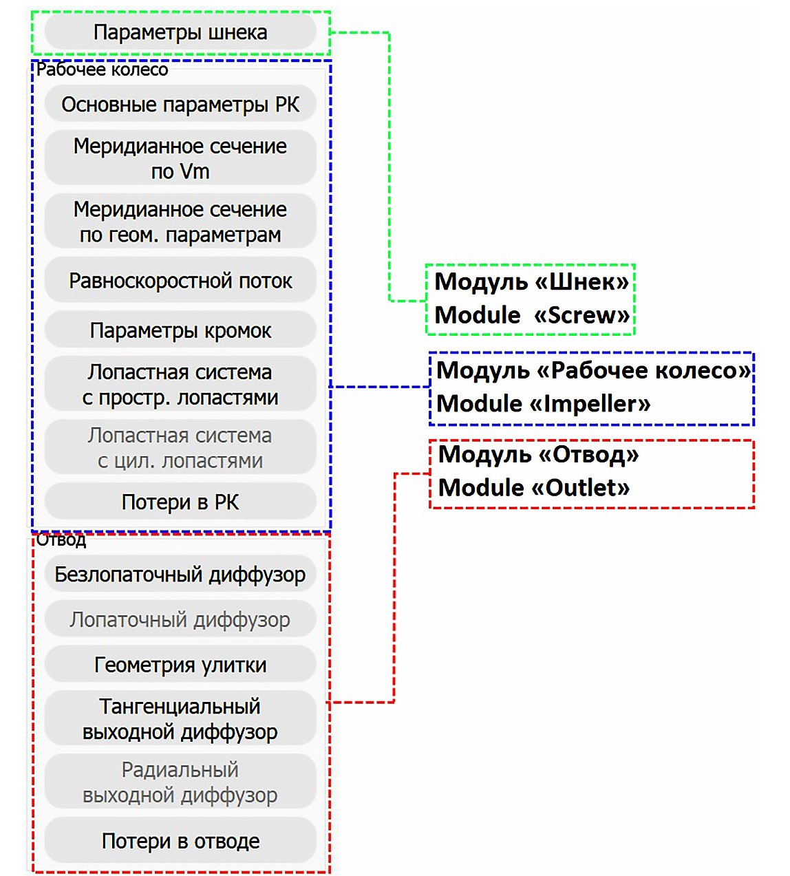 Каждый из модулей состоит из множества подмодулей, отвечающих за каждый этап проектирования конкретного элемента проточной части. Функционирование каждого модуля представляет собой последовательное выполнение подмодулей. Обмен данными между подмодулями выполняется с использованием внешних файлов.