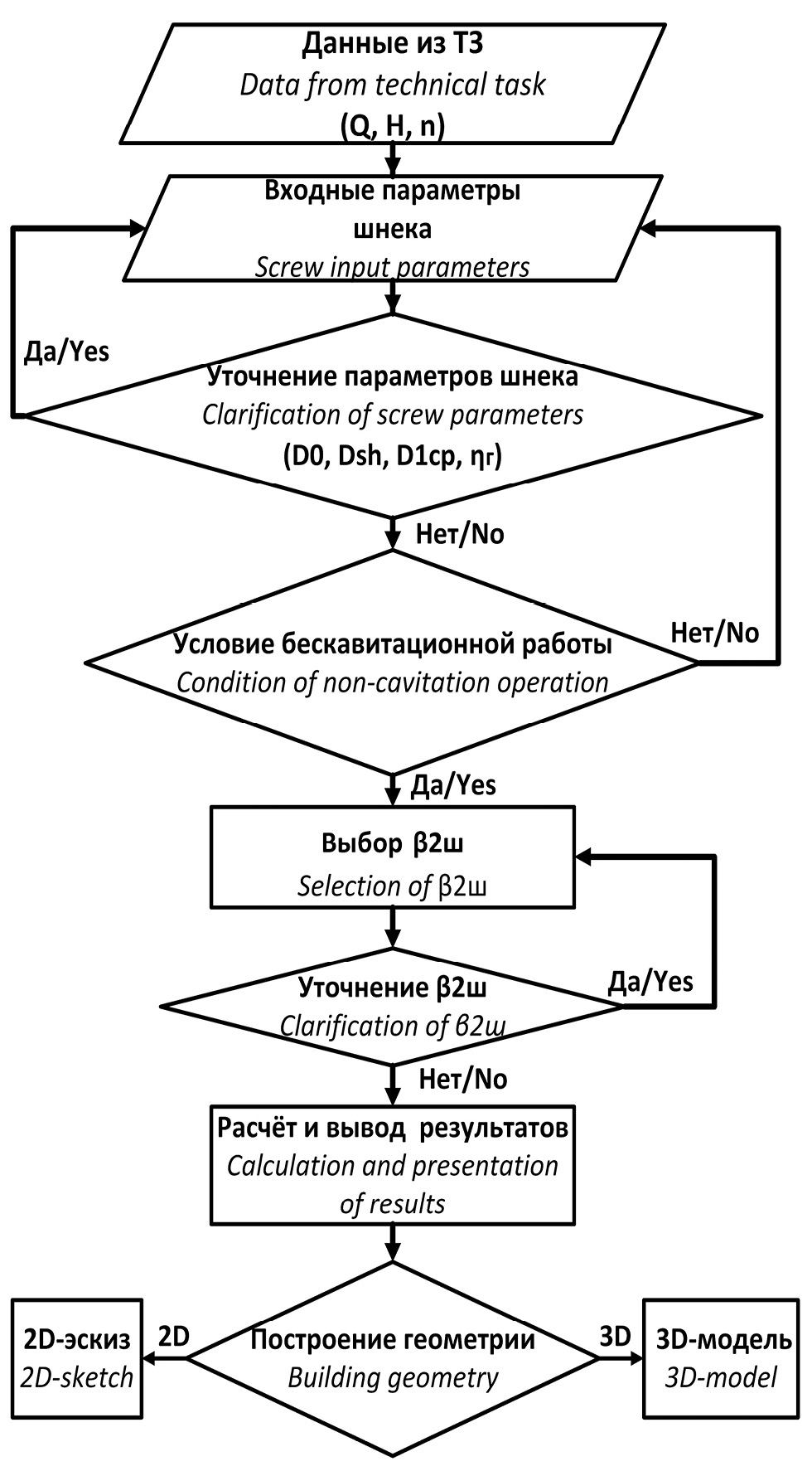 Рис. 3. Алгоритм проектирования шнека: Q — подача ступени, м³/c; H — напор ступени, м; n — частота вращения, об/мин; D0 — диаметр входа в рабочее колесо, м; Dsh — наружный диаметр шнека, м; D1ср — средний диаметр шнека, м; ηг — гидравлический КПД шнека; β2ш — угол выхода относительного потока за шнеком на расчётном диаметре, град.