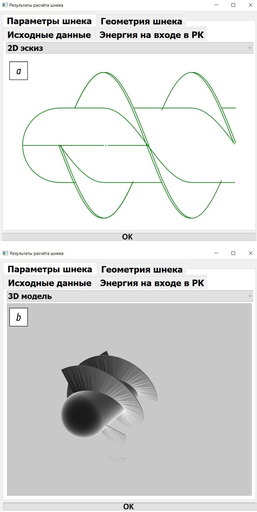 В интерфейсе разработанного программного обеспечения есть возможность вывести геометрию шнека либо в виде 2D-эскиза (рис. 4, а), либо в 3D-модели (рис. 4, b). Автоматизация построения 3D-модели выполнена с помощью API CAD-системы КОМПАС-3D [12]. При записи макроса было выявлено, что создание массива лопастей шнека сопряжено с определёнными сложностями, поэтому процесс создания лопастей включён в цикл, ограниченный по количеству лопастей.