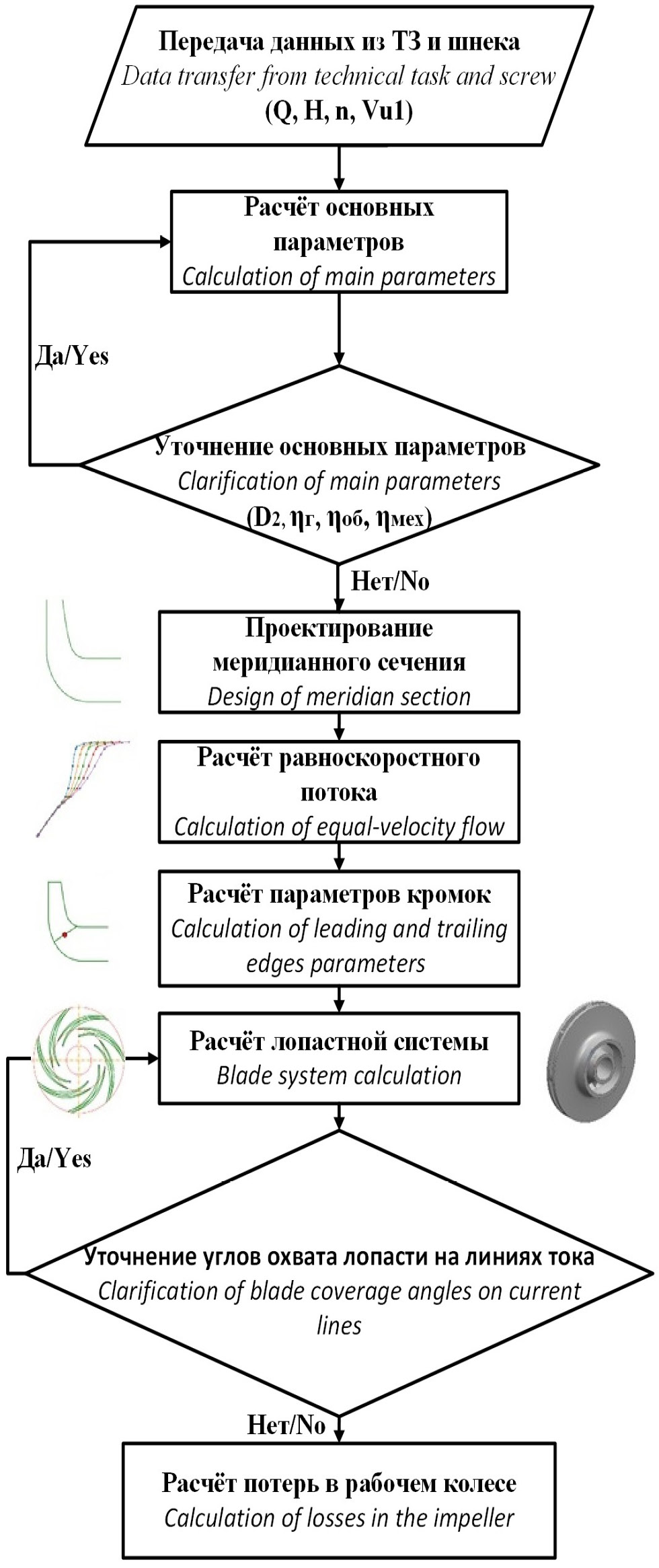 Последовательность вызова подмодулей по проектированию рабочего колеса приведена на рис. 5. Аналогично модулю «Шнек» в начале процесса проектирования есть возможность ввести предварительные геометрические параметры, на основании которых будут выполняться расчёты энергетических и геометрических параметров. В случае, если расчёт проводится без предварительного задания геометрических параметров, программный комплекс назначит входные данные самостоятельно на основании рекомендаций, изложенных в [13–14].