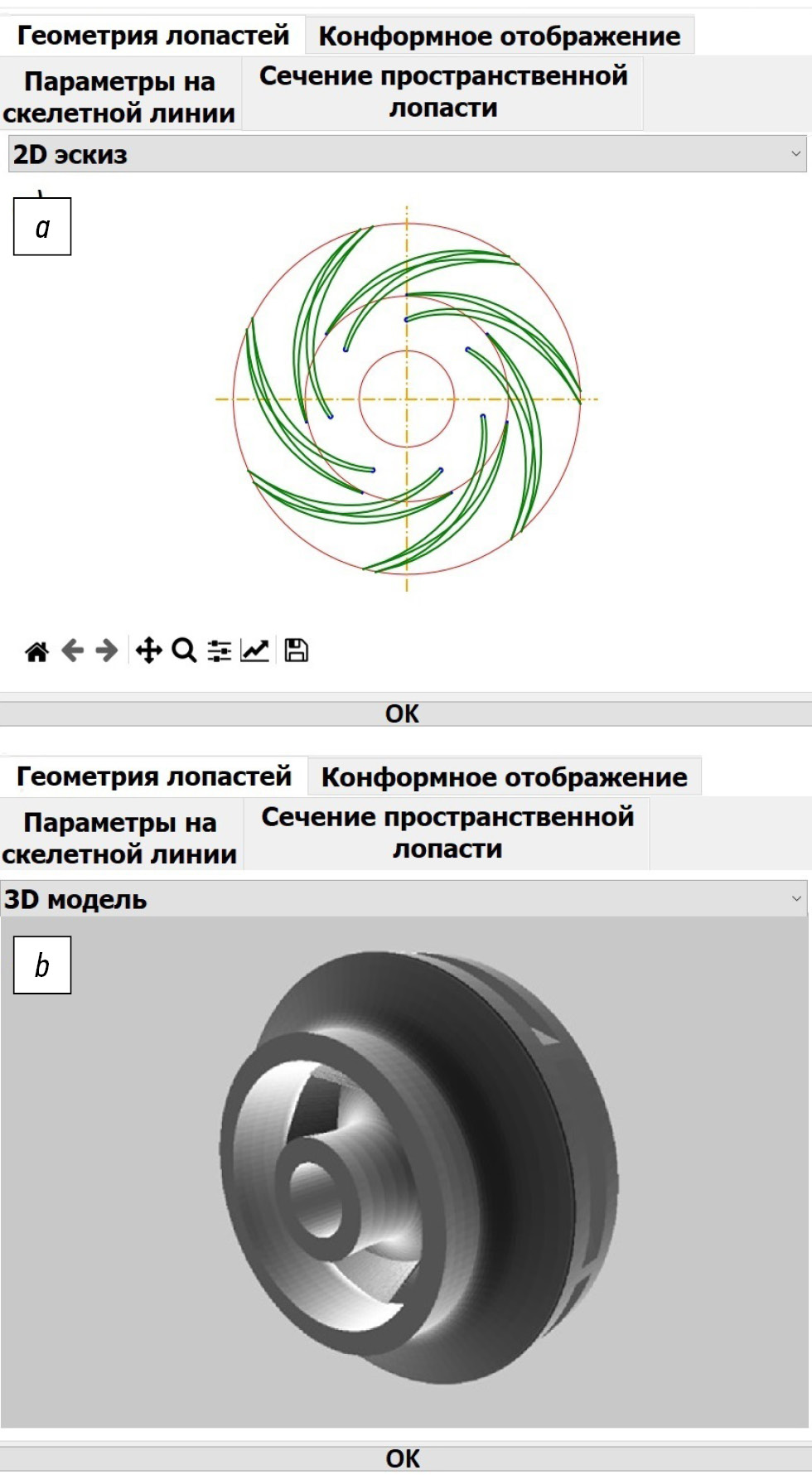 После завершения процесса проектирования появляется окно с визуализацией полученной лопастной системы. Существует возможность переключить отображение с 2D-эскиза (рис. 6, а) к полноценной 3D-модели (рис. 6, b), отображение которой интегрировано в интерфейс разработанного программного комплекса. Для подобной визуализации модель, построенная с помощью API «Компас-3D», конвертируется в фасетное тело. Полученный файл с фасетным телом используется совместно с библиотекой PyOpenGL [15].