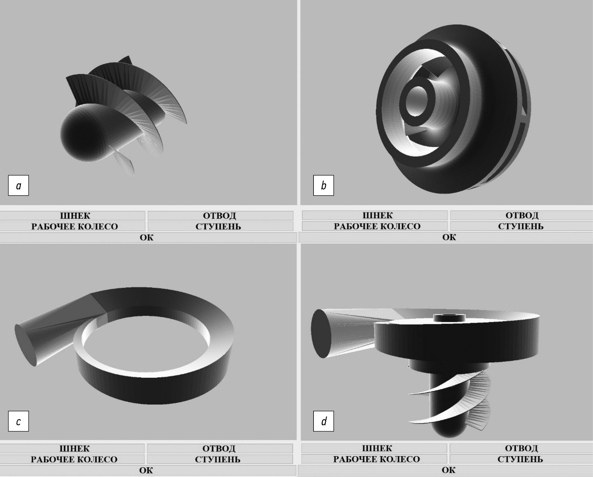 Рис. 8. 3D-модели элементов проточной части: а — 3D-модель шнека; b — 3D-модель рабочего колеса; c — 3D-модель спирального отвода; d — 3D-модель ступени.