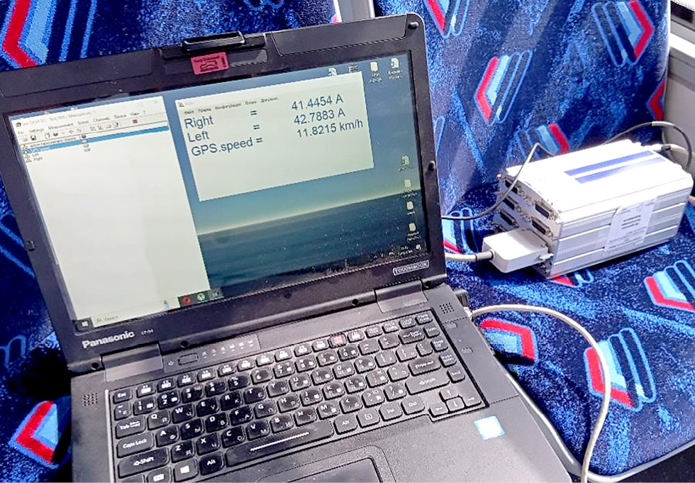 Системы транспортного средства оснащены датчиками для фиксации параметров процессов их работы. Тяговый электрический привод оснащён датчиками частоты вращения ротора и фазных токов, позволяющими автономному инвертору напряжения рассчитывать развиваемый электромагнитный момент двигателя с помощью наблюдателя электромагнитного момента [12], нагрузка на колесе определяется с помощью наблюдателя момента сопротивления в процессе управления [13]. Регистрируется также угловая скорость всех колёс. Динамика кузова транспортного средства регистрируется с помощью датчиков линейных и угловых ускорений по всем координатам.