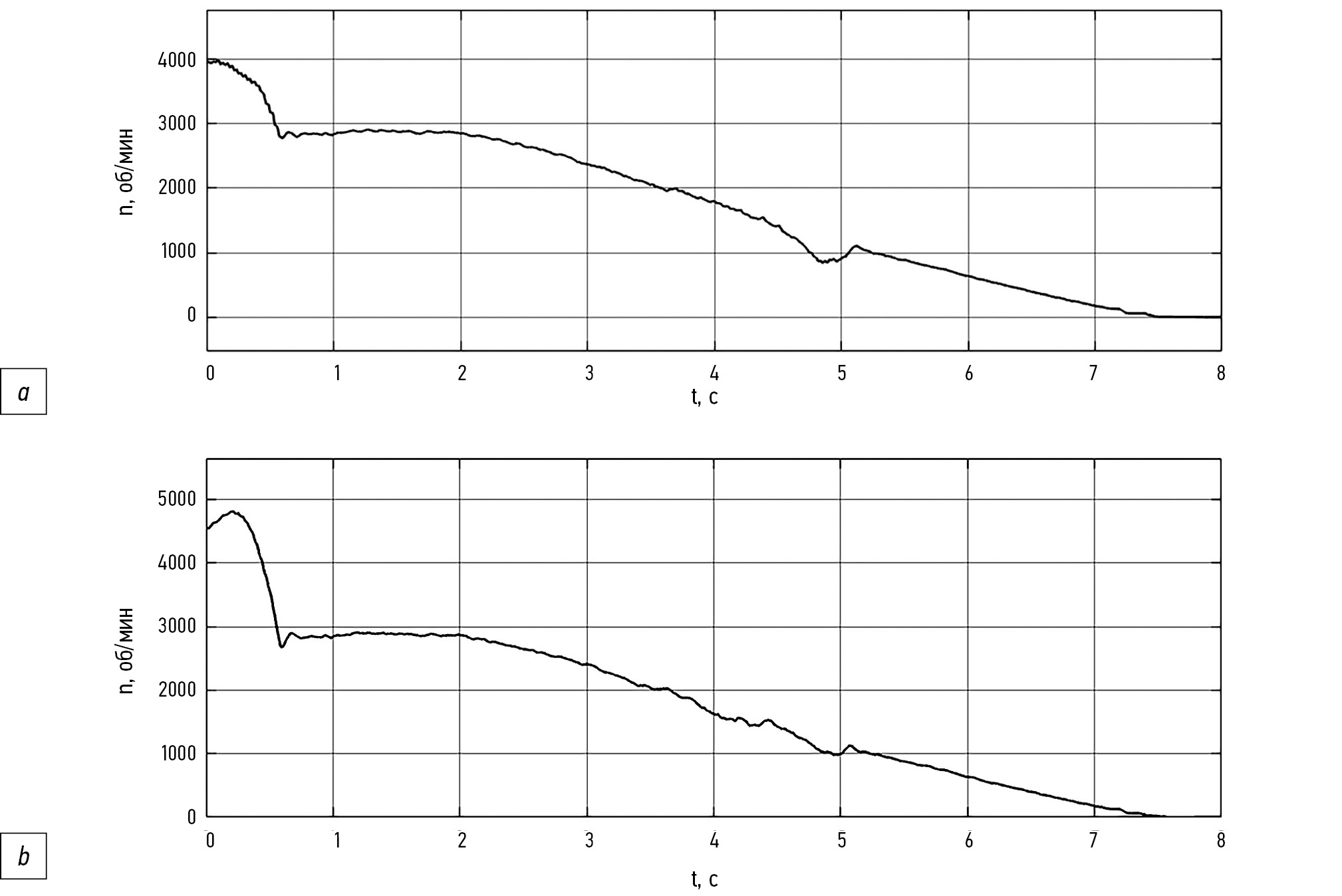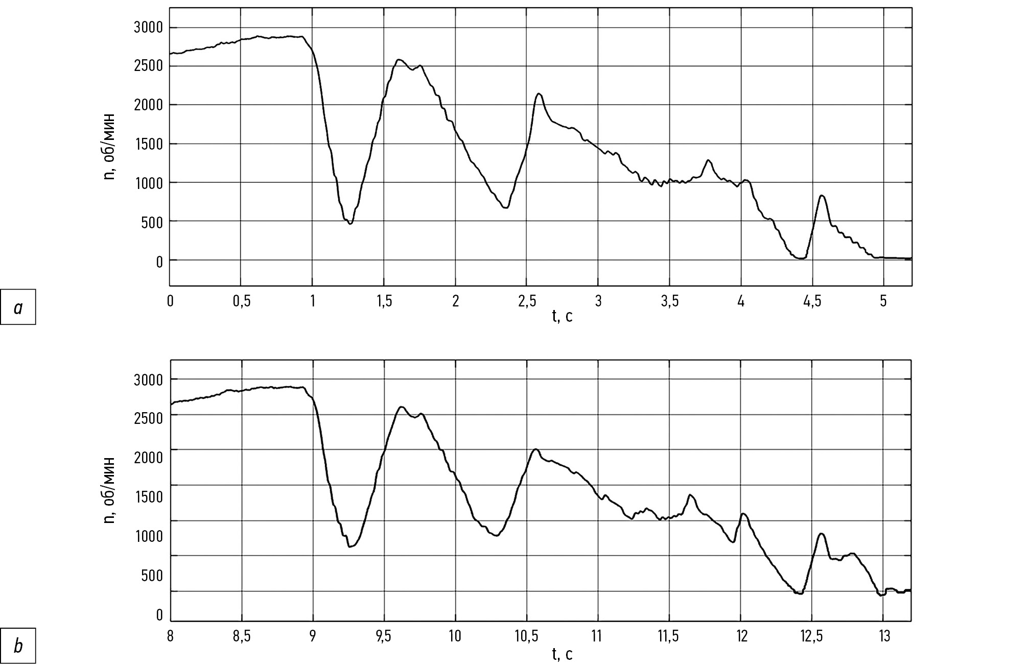 Рис. 15. Частота вращения колеса с деактивированной системой подавления автоколебаний, заезд № 2: a — левого; b — правого.