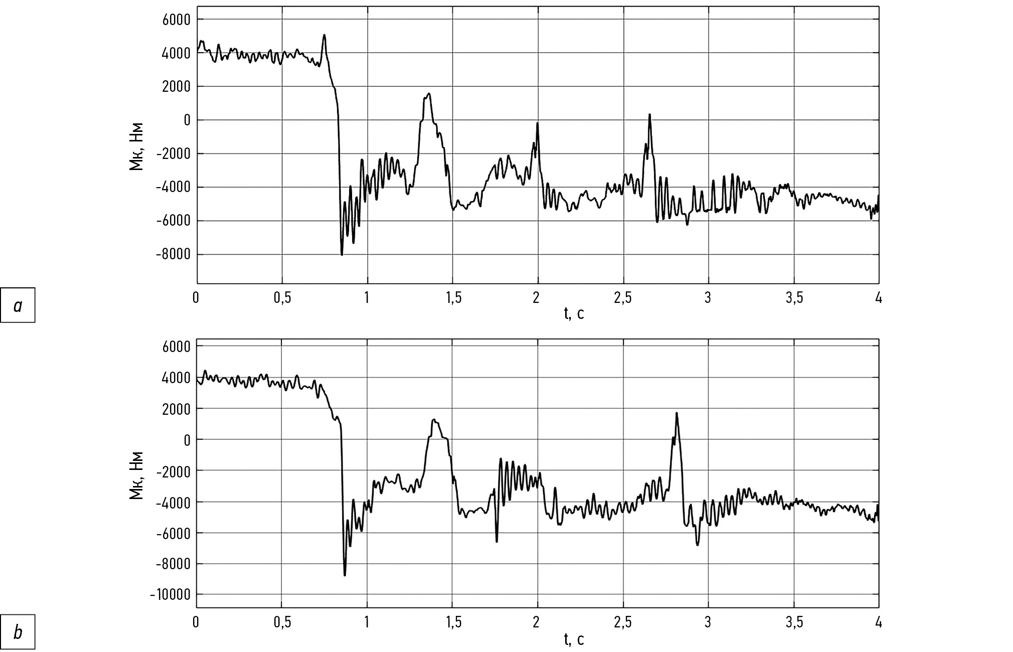 Рис. 14. Крутящий момент на колесе с деактивированной системой подавления автоколебаний, заезд № 2: а — левом; b — правом.