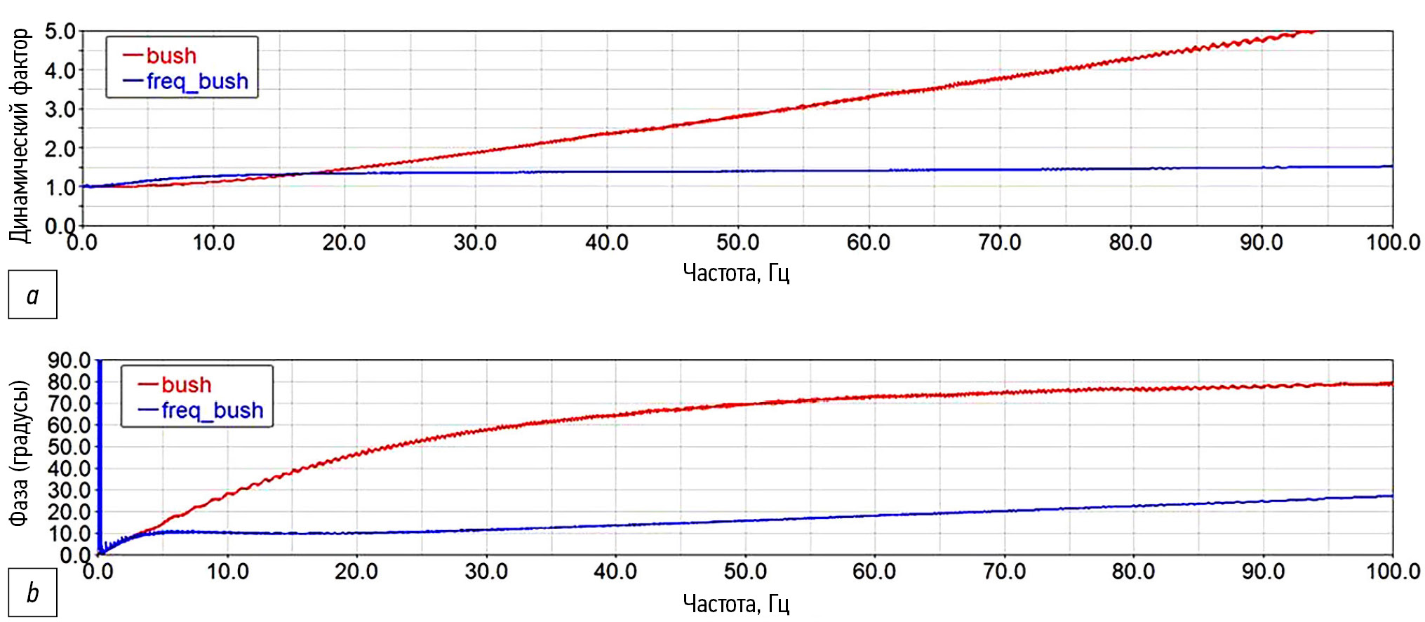 Рис. 2. Сравнение динамических характеристик моделей шарниров, обладающих линейным демпфированием (красная линия) и частотнозависимым демпфированием (синяя линяя): а — динамический фактор в зависимости от частоты возбуждения; b — угол потерь в зависимости от частоты возбуждения [1].