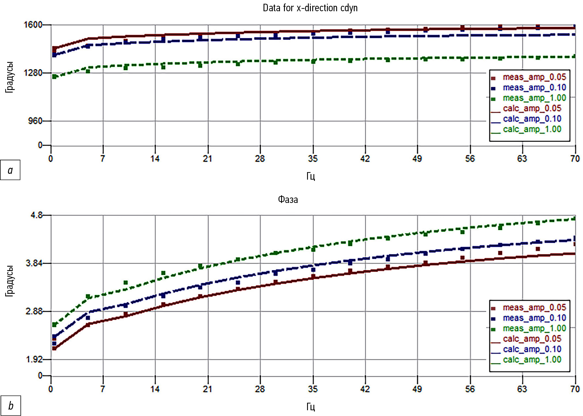Рис. 3. Измеренные (точки, meas_amp) и расчётные (сплошные линии, calc_amp) характеристики динамической жёсткости и углов потерь опоры ПГП для амплитуд 0,05, 0,1 и 1 мм: а — динамический фактор в зависимости от частоты возбуждения; b — угол потерь в зависимости от частоты возбуждения.