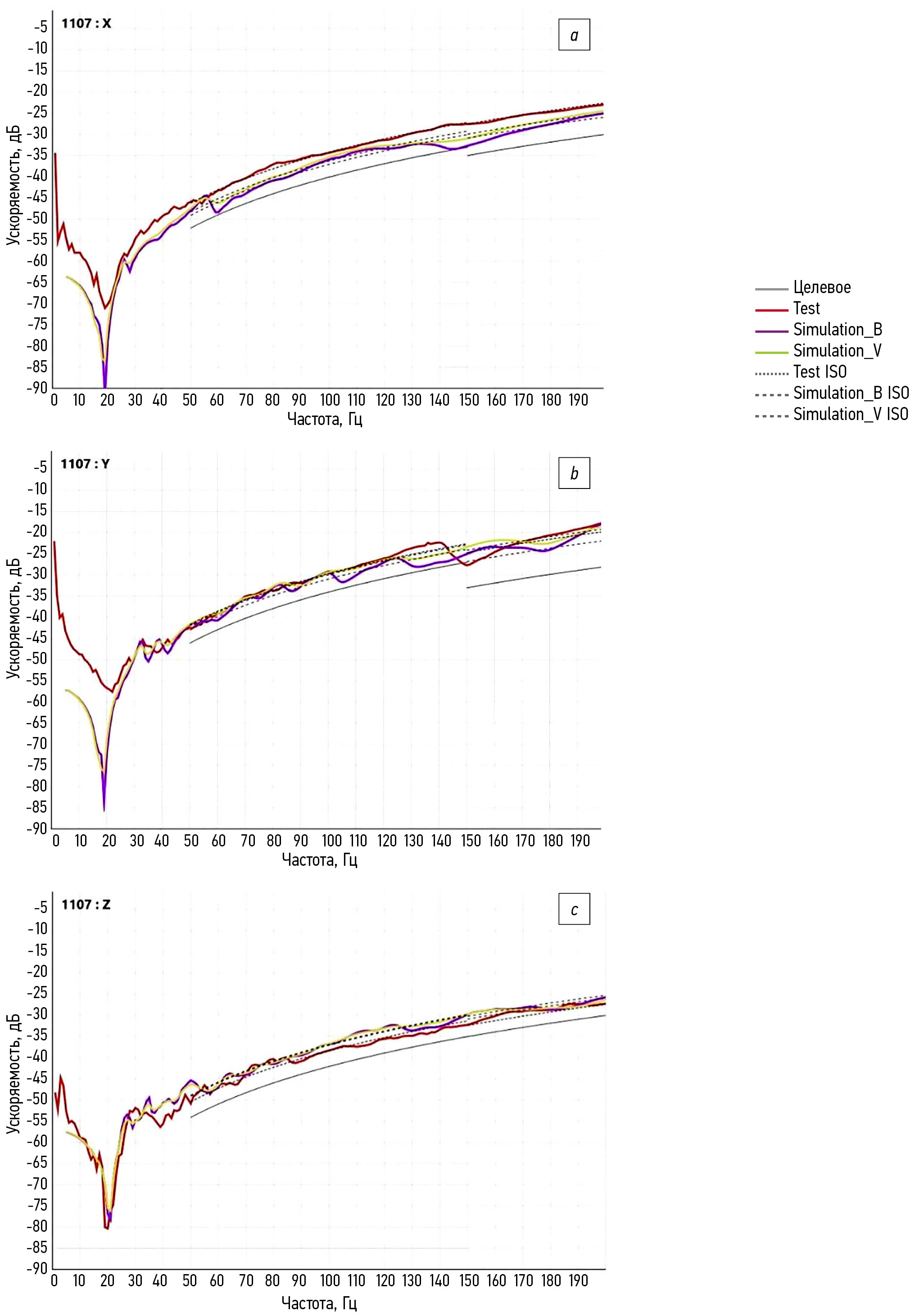 Рис. 4. Исследования ускоряемости задней левой точки крепления переднего подрамника к кузову автомобиля а — вдоль продольной оси автомобиля; b — вдоль поперечной оси автомобиля; c — вдоль вертикальной оси автомобиля; линии «Целевое» — кривые целевых значений ускоряемости по частоте; линии «Test» — кривые результатов экспериментальных исследований; линии «Simulation_B» — кривые результатов моделирования для исходной расчётной конечно-элементной модели; линии «Simulation_V» — кривые результатов моделирования для модели, приведённой в соответствие с результатами экспериментальных исследований; линии с приставкой ISO — изолинии соответствующих экспериментальных и расчётных результатов.