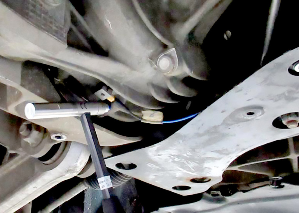В качестве валидационного базиса используются результаты модальных испытаний передней главной передачи в составе автомобиля в сборе. Суть модальных испытаний заключается в замере ускорений объекта испытаний при создании внешнего возмущения путём удара модальным молотком с последующим преобразованием в частотный отклик [7]. В ходе испытаний автомобиль находился на ровной опорной поверхности. Удары наносились в продольном и вертикальном направлениях в зоне крепления передней правой опоры к переднему подрамнику (рис. 5). Датчики ускорений были установлены на каждой опоре со стороны картера главной передачи и со стороны подрамника на головках болтов (рис. 6). Полученные записи ускорений в дальнейшем преобразованы в частотный спектр в программном комплексе Simcenter Testlab.