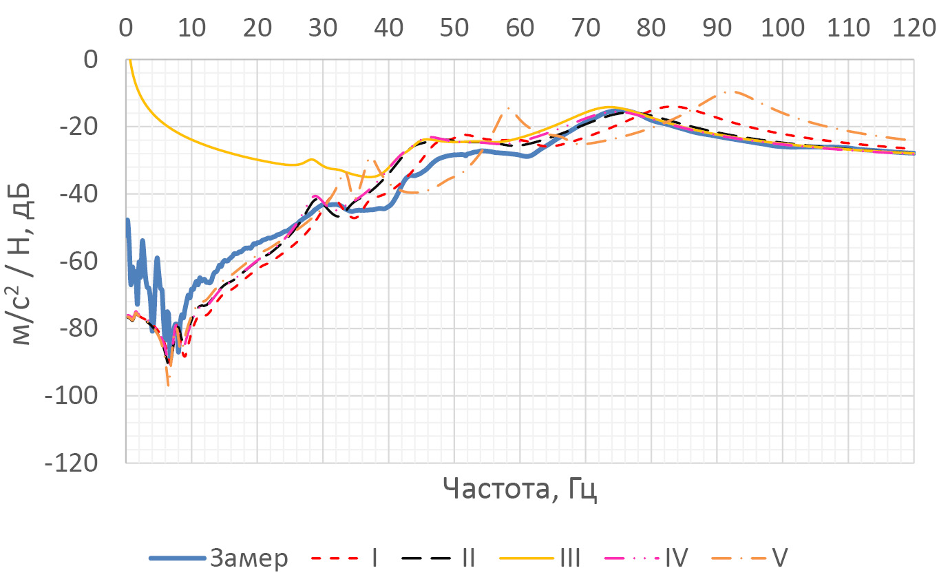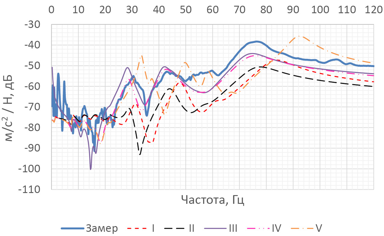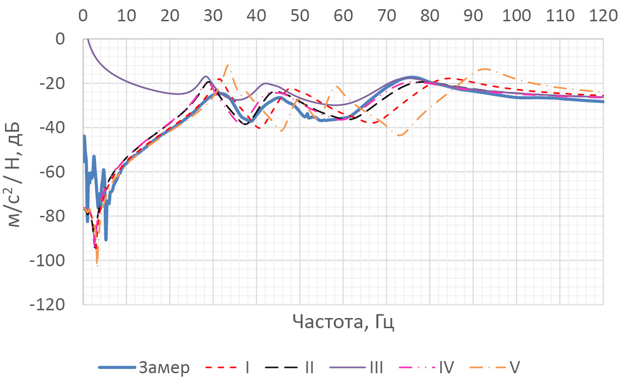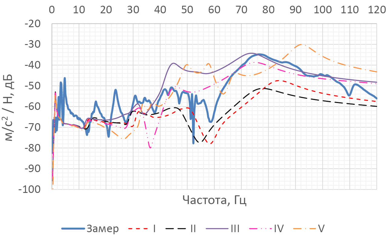 Рис. 8. Частотная характеристика отклика подрамника на ПЛ опоре в продольном направлении при продольном воздействии: линия «Замер» — кривая результатов экспериментальных исследований; линия I — кривая результатов расчёта для многозвенной модели с исходным описанием опор на базе модели Пфеффера и жёстким кузовом; линия II — кривая результатов расчёта для многозвенной модели со скорректированным описанием опор на базе модели Пфеффера и жёстким кузовом; линия III — кривая результатов расчёта для многозвенной модели со скорректированным описанием опор на базе модели Пфеффера и с учётом локальной динамической жёсткости подрамника посредством промежуточных упругих связей; линия IV — кривая результатов расчёта для многозвенной модели со скорректированным описанием опор на базе модели Пфеффера и описанием подрамника в виде редуцированной КЭ-модели; линия V — кривая результатов расчёта для многозвенной модели с многофакторной частотнозависимой моделью опор и описанием подрамника в виде редуцированной КЭ-модели.