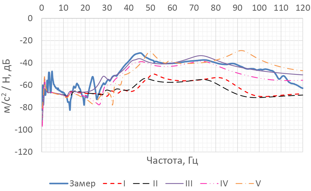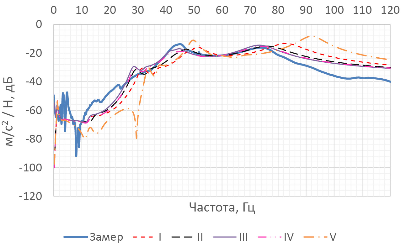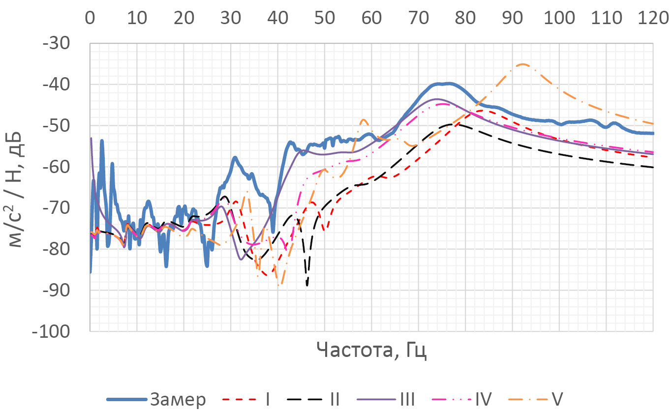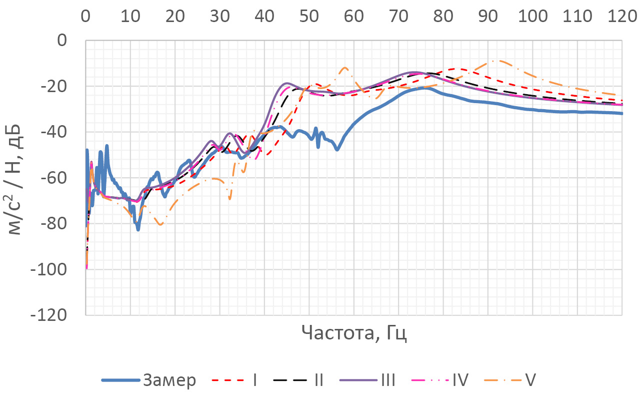 Рис. 8. Частотная характеристика отклика подрамника на ПЛ опоре в продольном направлении при продольном воздействии: линия «Замер» — кривая результатов экспериментальных исследований; линия I — кривая результатов расчёта для многозвенной модели с исходным описанием опор на базе модели Пфеффера и жёстким кузовом; линия II — кривая результатов расчёта для многозвенной модели со скорректированным описанием опор на базе модели Пфеффера и жёстким кузовом; линия III — кривая результатов расчёта для многозвенной модели со скорректированным описанием опор на базе модели Пфеффера и с учётом локальной динамической жёсткости подрамника посредством промежуточных упругих связей; линия IV — кривая результатов расчёта для многозвенной модели со скорректированным описанием опор на базе модели Пфеффера и описанием подрамника в виде редуцированной КЭ-модели; линия V — кривая результатов расчёта для многозвенной модели с многофакторной частотнозависимой моделью опор и описанием подрамника в виде редуцированной КЭ-модели.