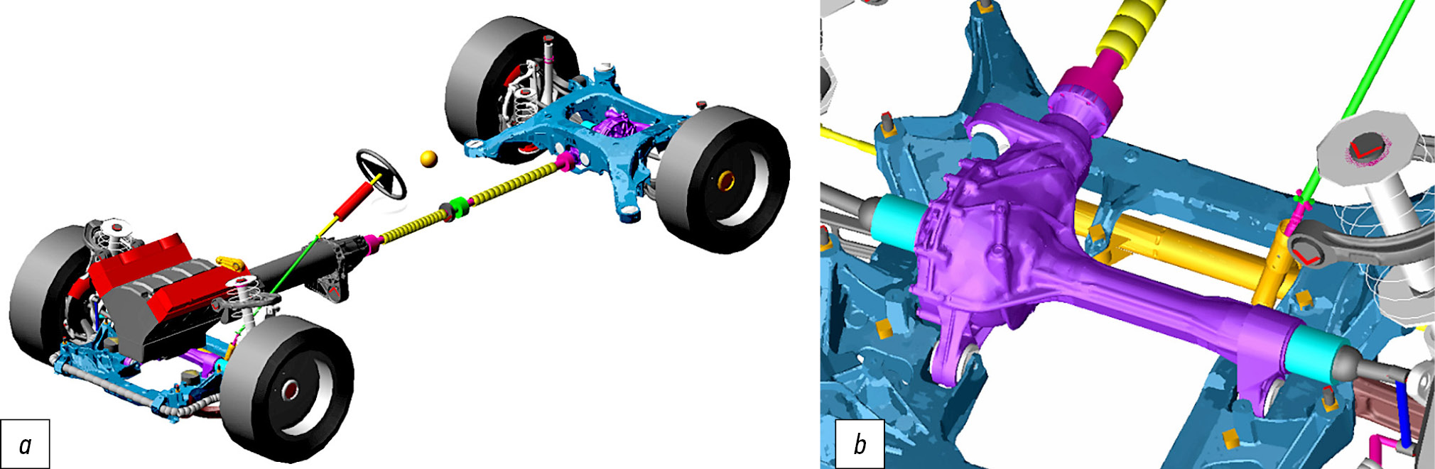 Fig. 1. Image of the multibody mathematical model of the vehicle: а — the general view; b — the scaled image of the front axle drive (FAD).