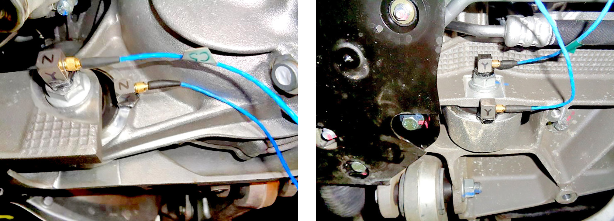 Fig. 6. Acceleration sensors installed at the mounts of the front axle drive.