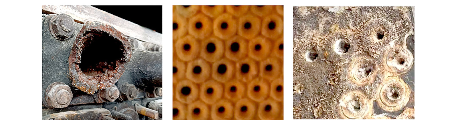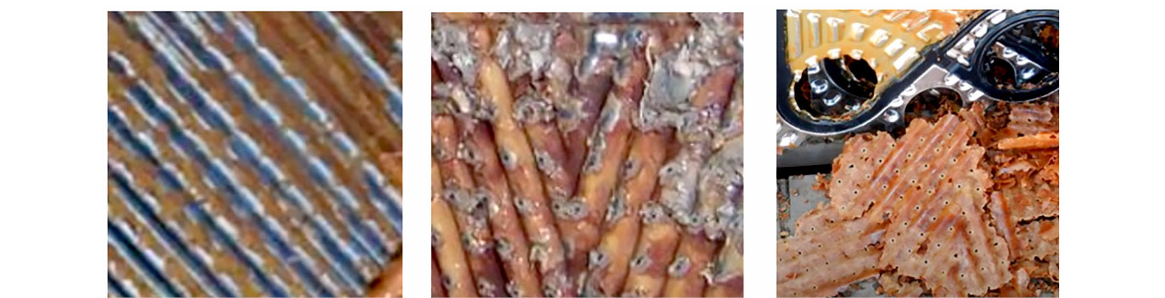 Использование воды ненадлежащего качества приводит к ускоренному загрязнению теплообменных поверхностей, особенно в испарительных аппаратах. Паровая фаза не способна унести с собой большое количество загрязняющих элементов, и они осаждаются на теплообменных поверхностях. Так, на рис. 1 и 2 показаны различные варианты загрязнений теплообменных поверхностей пластинчатых и кожухотрубных аппаратов.