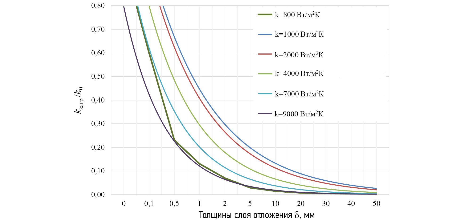 Как видно из рис. 1, с увеличением толщины отложений отношение стремительно убывает. Также стоит отметить, что наиболее заметно влияние толщины отложения на такие теплообменные аппараты, в которых изначально было заложено высокое значение коэффициента теплопередачи. Говоря другими словами, чем больше изначальное значение коэффициента теплопередачи, тем сильнее на него оказывает влияние загрязнение.