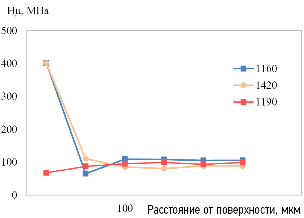 Как видно из рис. 4, для образца 1190 поверхность сплава упрочняется, а на расстоянии 30–70 мкм от поверхности образца алюминиевого сплава происходит постепенное разупрочнение и микротвёрдость сплава плавно снижается до значений твёрдости основы — 100 МПа. Сплав 1420 в результате ионной имплантации упрочняется, при этом значения его микротвёрдости у поверхности составляют 410 МПа, после чего следует постепенное снижение данной характеристики на расстоянии 40–50 мкм от поверхности вплоть до значений микротвердости основы 110 МПа. Что же касается образца 1160, то в нём происходит разупрочнение сплава, при этом значения твёрдости у поверхности составляют около 65 МПа, что существенно ниже, чем твёрдость основы (110 МПа).