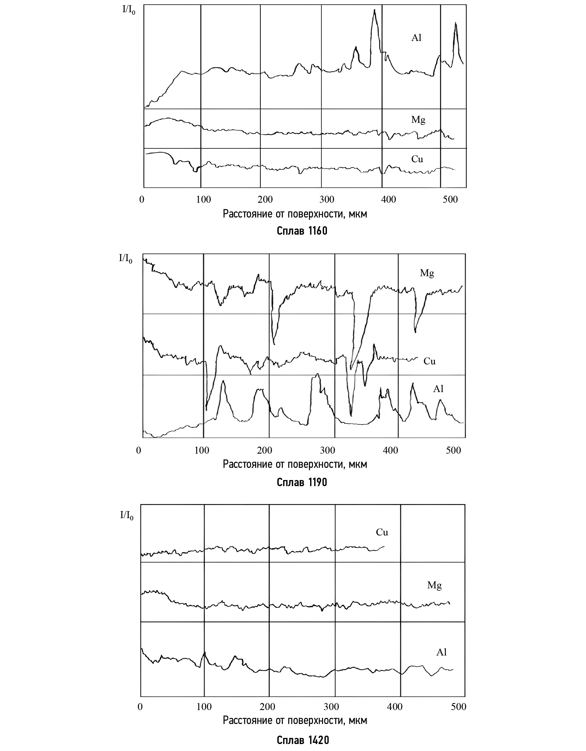 На рис. 5 представлено качественное распределение в глубь элементов Cu, Mg, Al в поверхностном слое сплавов 1420, 1190 и 1160.