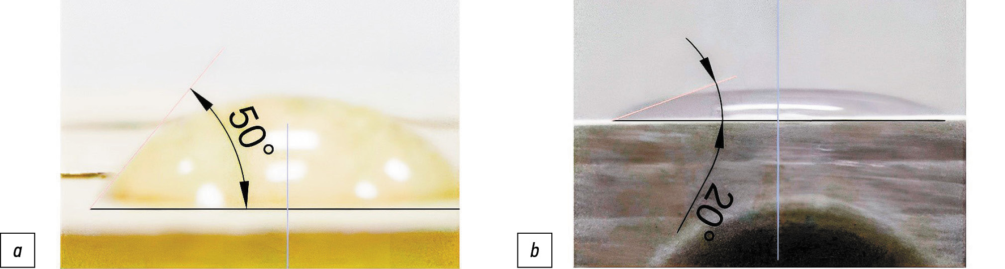 Рис. 6. Определение краевого угла смачивания на (a) имплантированной поверхности, (b) стандартной поверхности.