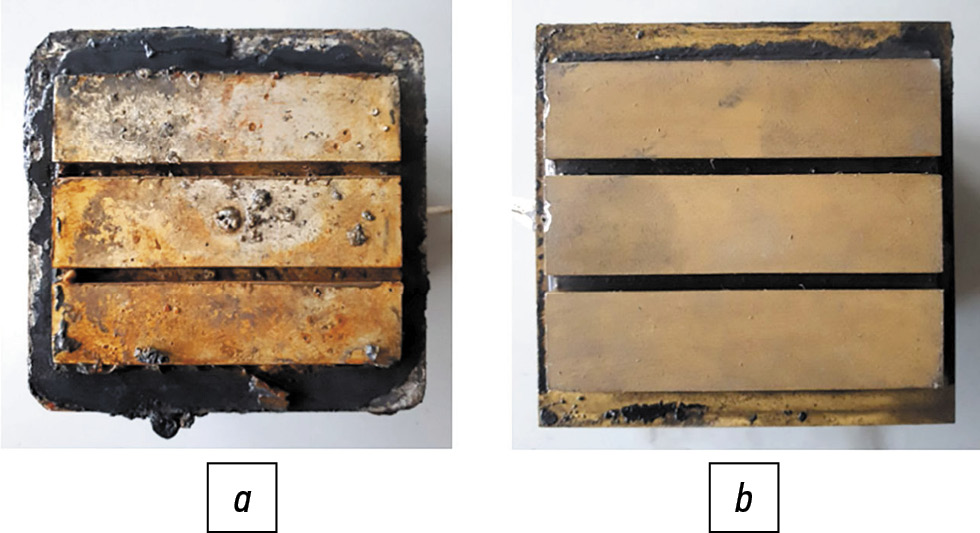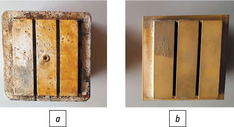 Рис. 7. Воздействие на теплопередающую ячейку ПАВ и неправильной консервации: a — неимплантированная ячейка; b — имплантированная ячейка.
