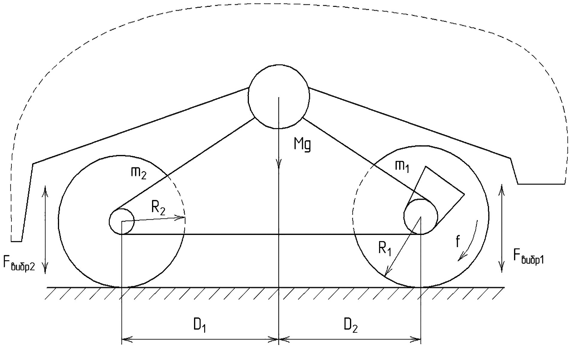 Уравнение движения системы строится из соображений, что под действием периодической силы рабочий орган может совершать вращательное движение вокруг центра масс системы и поступательное движение как единое целое — вместе с рамой катка [8–10].