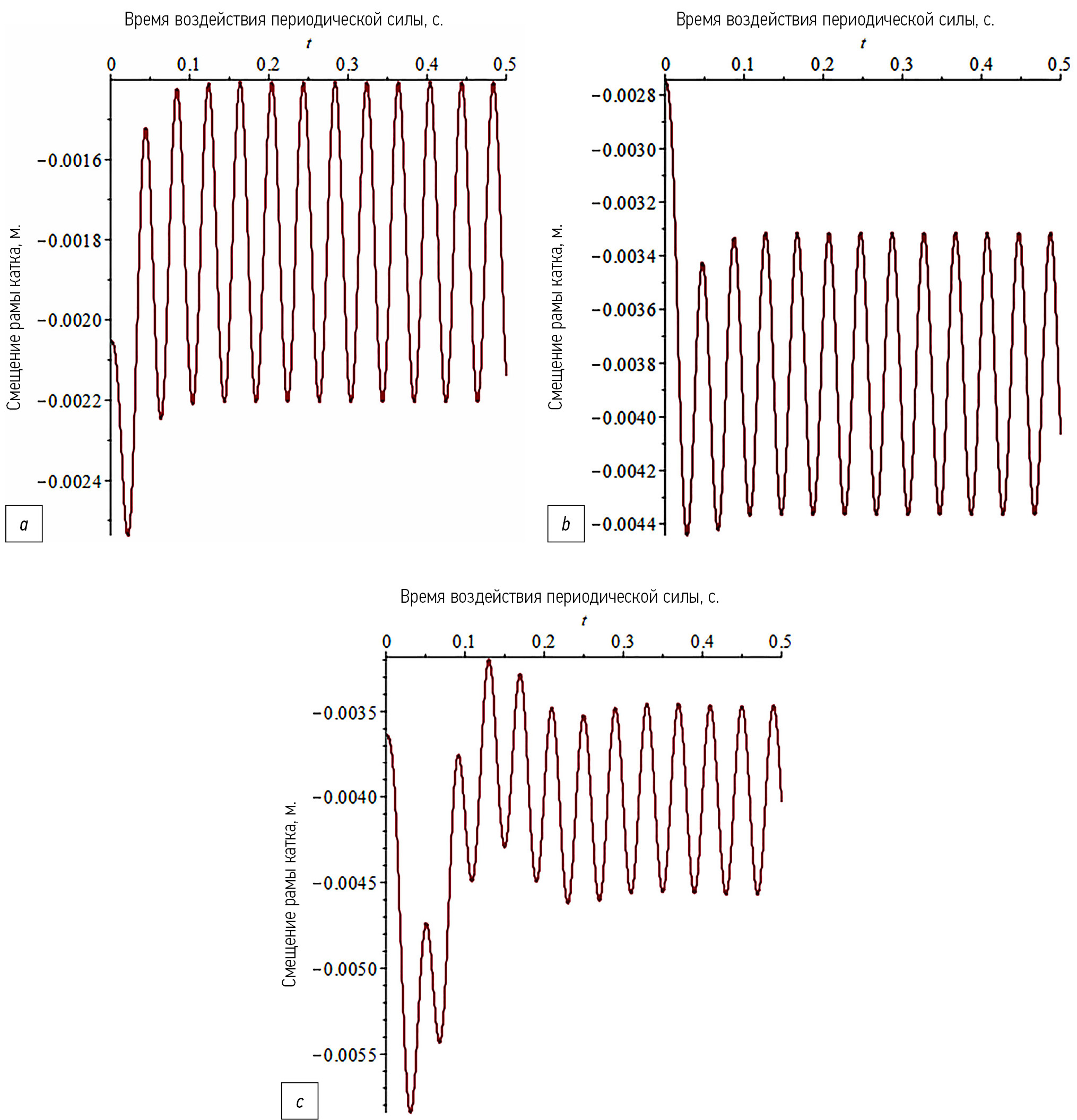 Рис. 4. Смещения рамы катка zM, м за время воздействия периодической силы 0,5 с при: a: D1/D2 = 0,25; b: D1/D2 = 0,5; c: D1/D2 = 1.