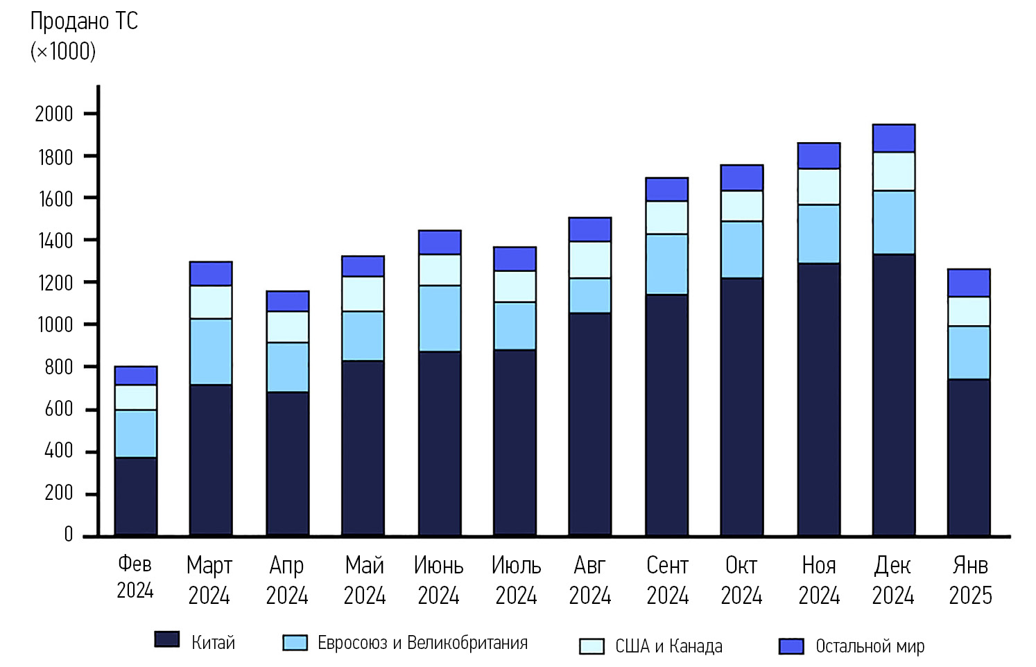 В январе 2025 г. Китай подтвердил лидерство на рынке электромобилей, реализовав 700 000 единиц. Европейский союз и Великобритания вместе продали 250 000 электромобилей, тогда как рынок США и Канады достиг показателя в 130 000. Другие регионы мира суммарно реализовали 130 000 электромобилей, продемонстрировав рост на 50% по сравнению с январём 2024 г., хотя и показав небольшое снижение (-4%) относительно декабря 2024 г.