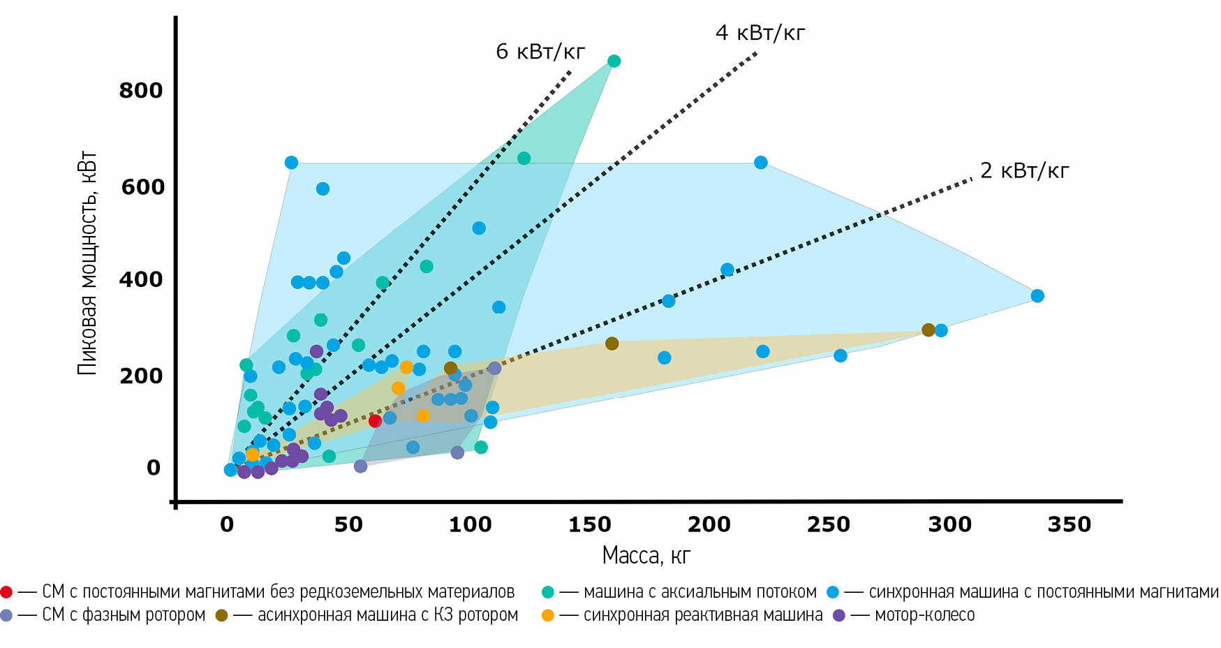 Согласно исследованиям ресурса IDTechEx Ltd (рис. 2), аксиальные электрические машины демонстрируют наилучшие удельные показатели среди различных типов электродвигателей. Анализ подтверждает их превосходство по ключевым параметрам мощности, момента и энергоэффективности [20].