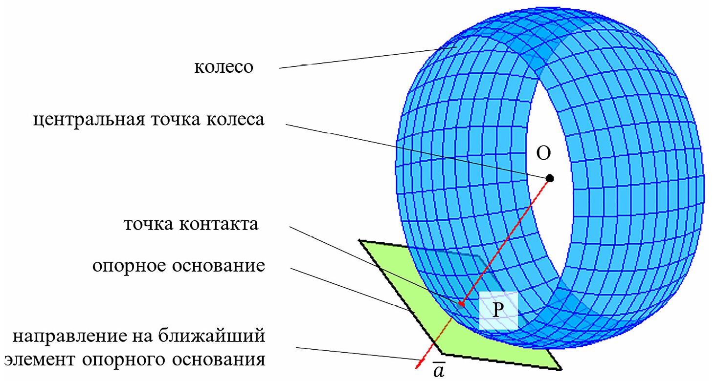 Таким образом, в предлагаемой модели задача поиска пересечения геометрии колеса с опорным основанием сводится к определению направления и расстояния от центральной точки колеса , до ближайшего элемента опорной поверхности (см. рис. 1). Если это расстояние окажется меньше заданного радиуса колеса, то можно говорить о наличии точки контакта P, которая будет расположена на направлении . Нормальные силы, возникающие при взаимодействии, будут действовать также вдоль направления . При этом, для каждого выпуклого элемента опорной поверхности может быть только одна точка контакта и вектор действия нормальных сил.