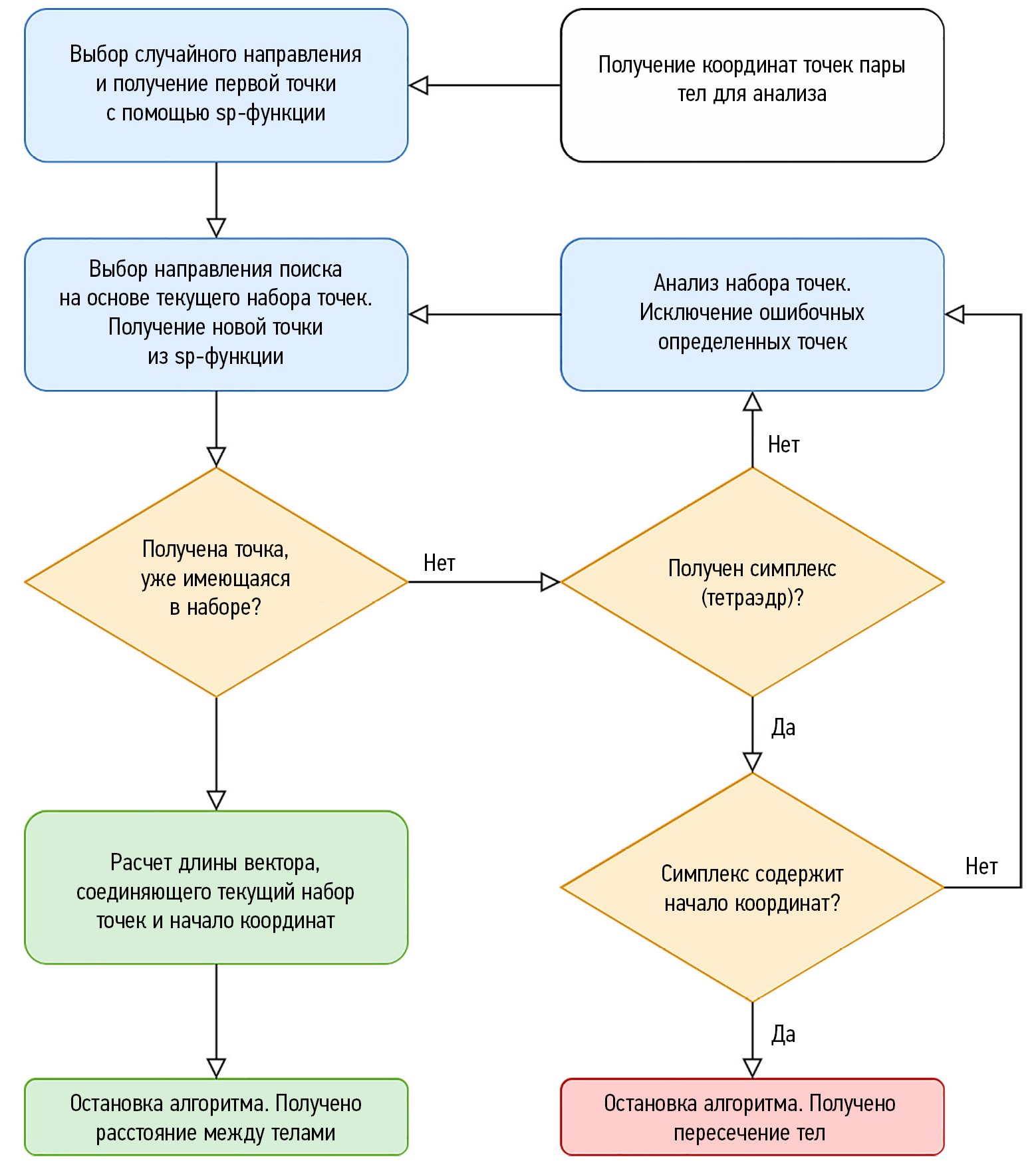 В случае отсутствия пересечения тел процесс поиска симплекса останавливается тогда, когда новая найденная точка уже будет содержаться в текущем наборе точек (то есть не удалось найти более удалённую точку). В этом случае направление и кратчайшее расстояние между телами будет определять вектор, соединяющий последний набор точек пространства Минковского и начало координат. Блок-схема, иллюстрирующая приведённый алгоритм, показана на рис 2.