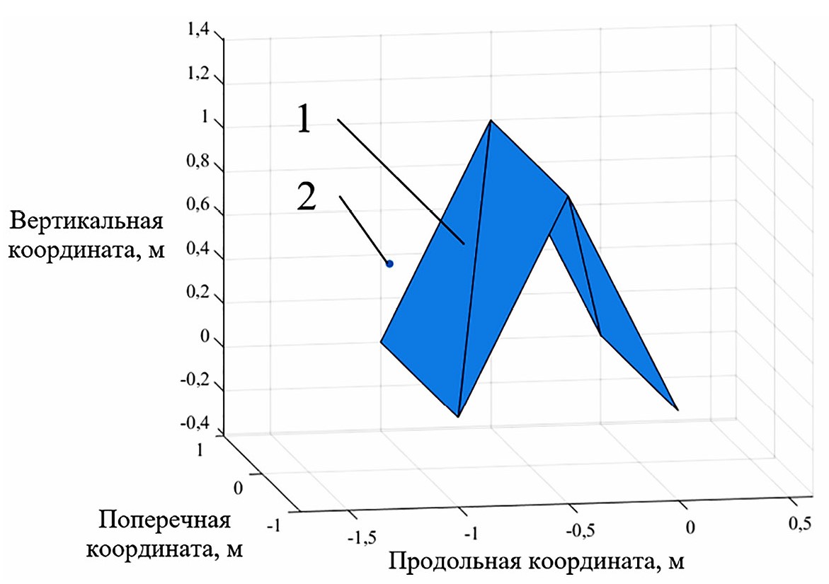 Рис. 3. Пример определения расстояния между точкой и многогранником: 1 — многогранник; 2 — точка.