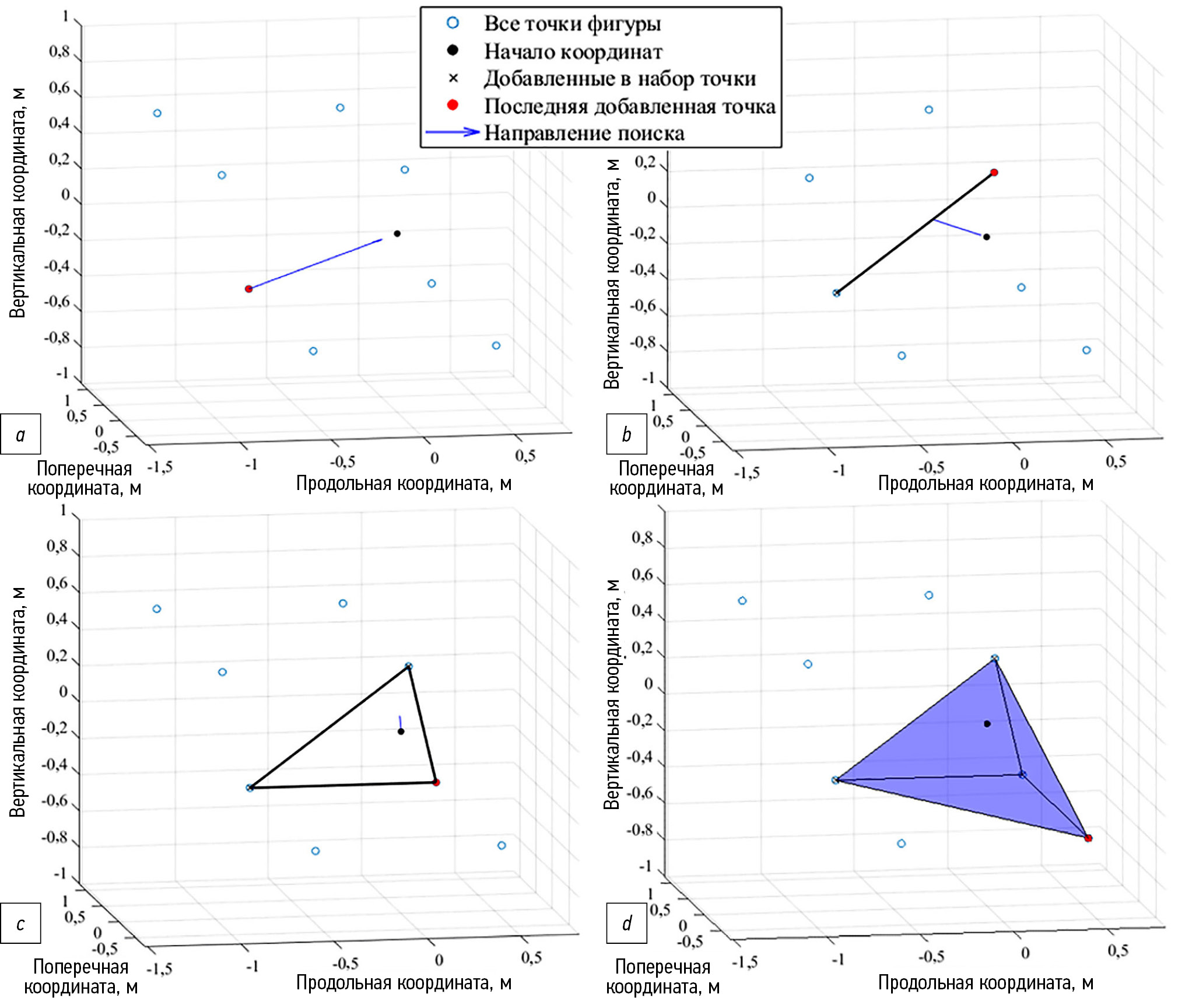 В процессе поиска пересечения набор точек последовательно расширяется от точки (см. рис. 4, a) до отрезка (см. рис. 4, b), затем происходит исключение ошибочно определённой точки и добавление новой (см. рис. 4, c). На рис. 4, d новая добавленная точка вместе с предыдущими образует треугольник. Новое направление поиска выбирается как вектор, перпендикулярный плоскости треугольника и направленный к началу координат. Однако, новых точек в этом направлении найти не удалось, поэтому вектор последнего направления поиска определяет расстояние и направление между исследуемыми телами (рис. 5).