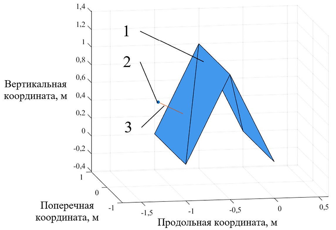 Рис. 5. Пример определения дистанции между точкой и многогранником: 1 — многогранник; 2 — точка; 3 — вектор, определяющий расстояние между телами.