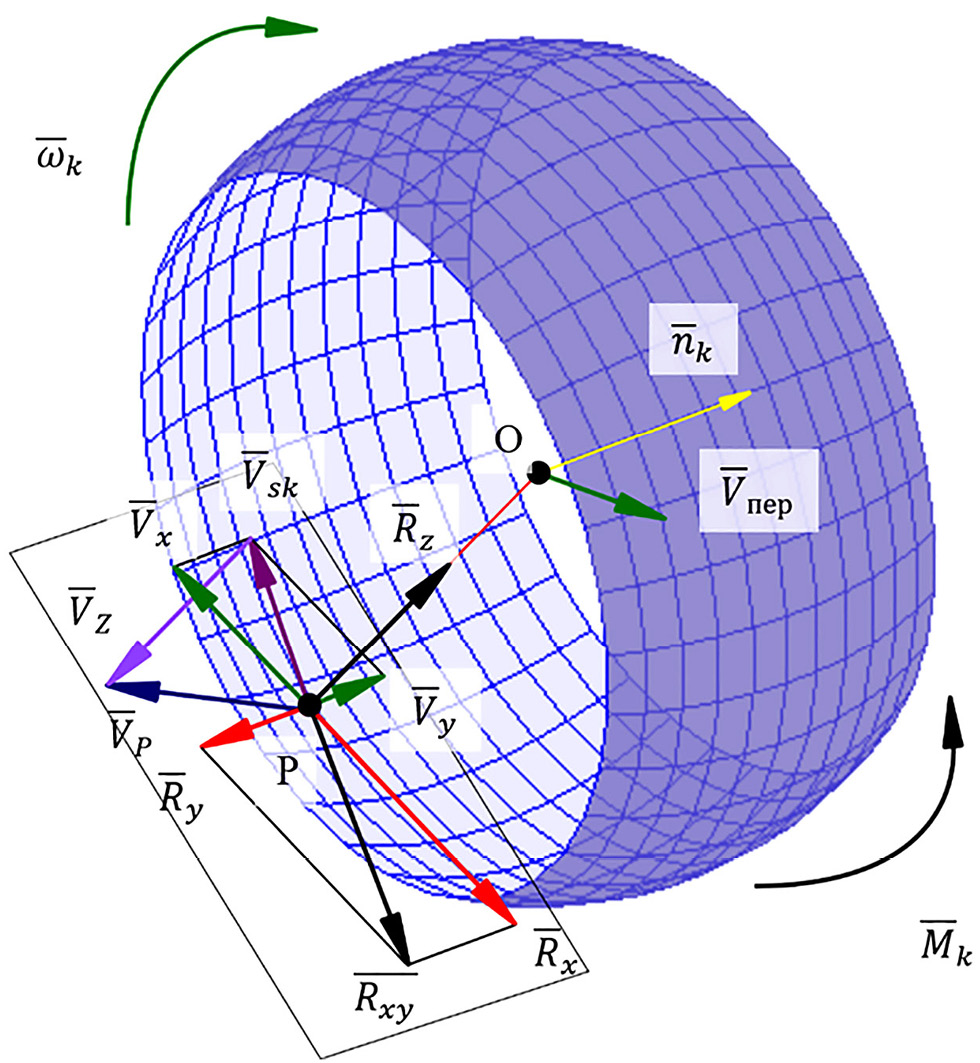 Так, момент определяет ту часть нагрузки от взаимодействия колеса с опорным основанием, которая воспринимается трансмиссией (и тормозными механизмами). Оставшуюся часть момента, вызванного касательной реакцией в контакте колеса с опорным основанием по отношению к его центру , а также вектор суммарной силы взаимодействия воспринимается цапфой, крепящей колесо к МР.
