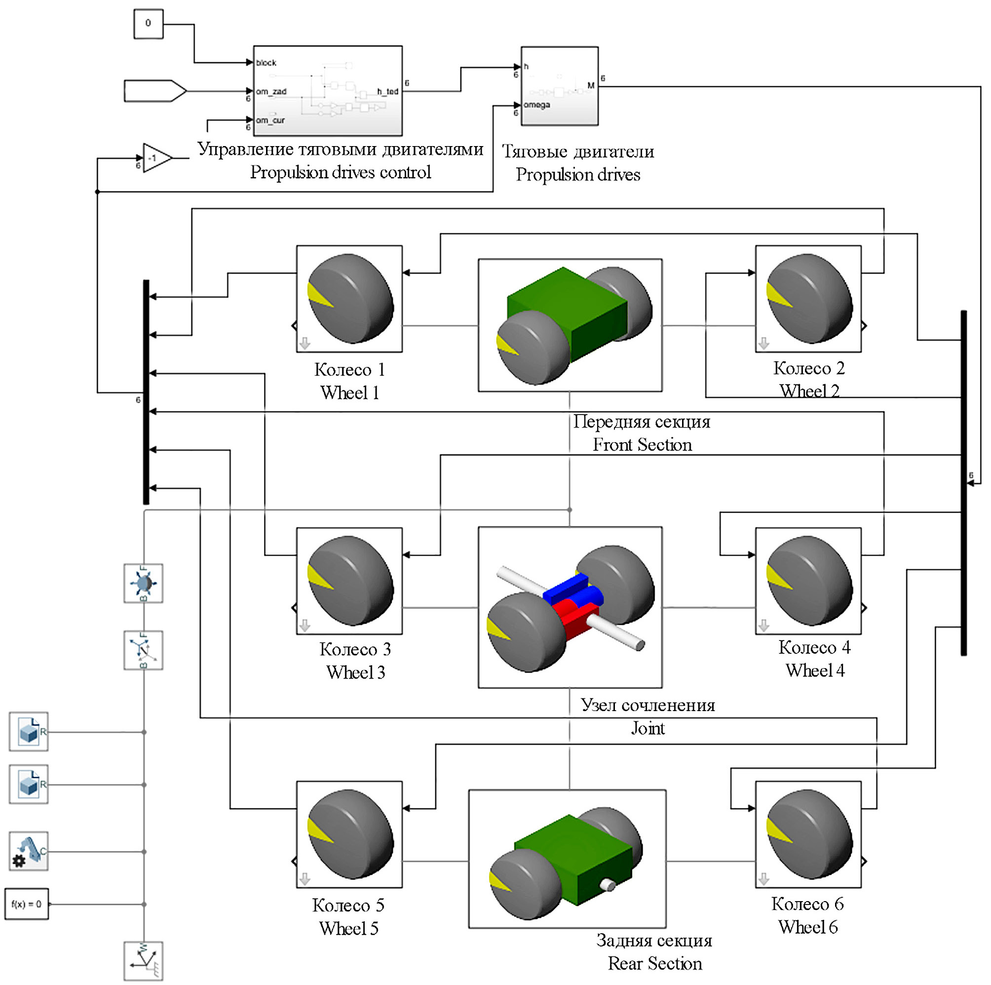 Силовые факторы и , описывающие взаимодействие колеса с опорной поверхностью в данной модели, передаются для дальнейших расчётов в систему МДС, где моделируется динамика МР (интерфейс модели динамики представлен на рис. 7).